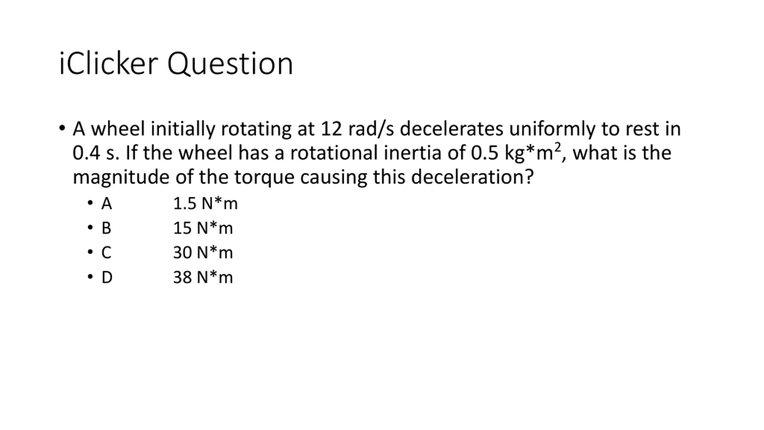 iClicker Question A wheel initially rotating at 12 rad/s decelerates uniformly to rest in 0.4 s. If the wheel has a rotational inertia of 0.5 kg*m2, what is the magnitude of the torque causing this deceleration? A 1.5 N*m B 15 N*m C 30 N*m D 38 N*m