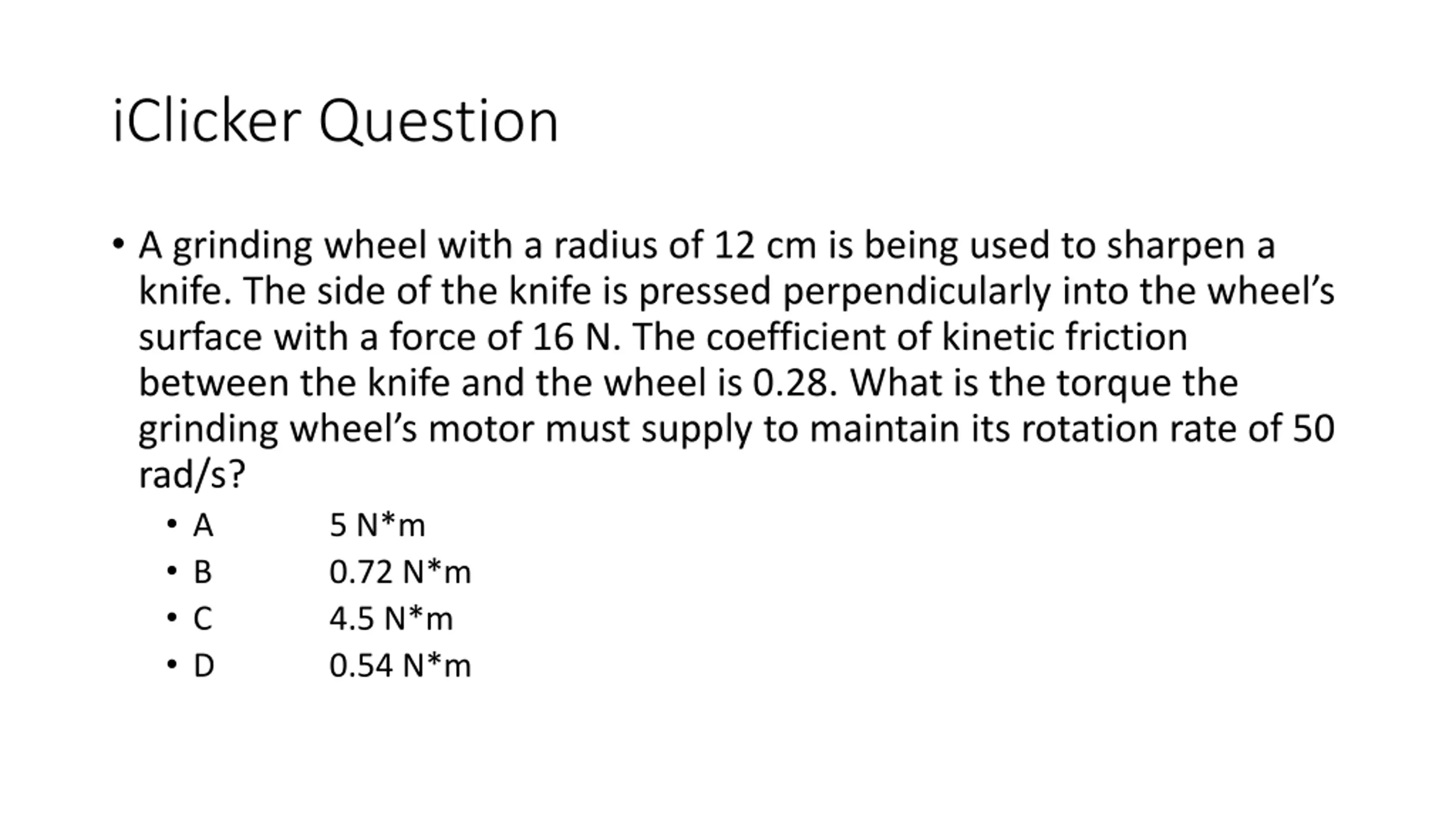 iClicker Question A grinding wheel with a radius of 12 cm is being used to sharpen a knife. The side of the knife is pressed perpendicularly into the wheel s surface with a force of 16 N. The coefficient of kinetic friction between the knife and the wheel is 0.28. What is the torque the grinding wheel s motor must supply to maintain its rotation rate of 50 rad/s? A 5 N*m B 0.72 N*m C 4.5 N*m D 0.54 N*m