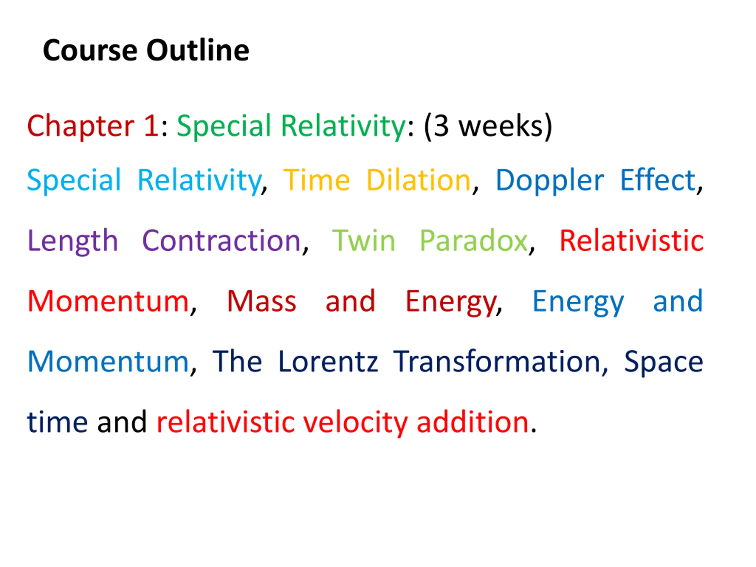 Course Outline Chapter 1: Special Relativity: (3 weeks) Special Relativity, Time Dilation, Doppler Effect, Length Contraction, Twin Paradox, Relativistic Momentum, Mass and Energy, Energy and Momentum, The Lorentz Transformation, Space time and relativistic velocity addition.