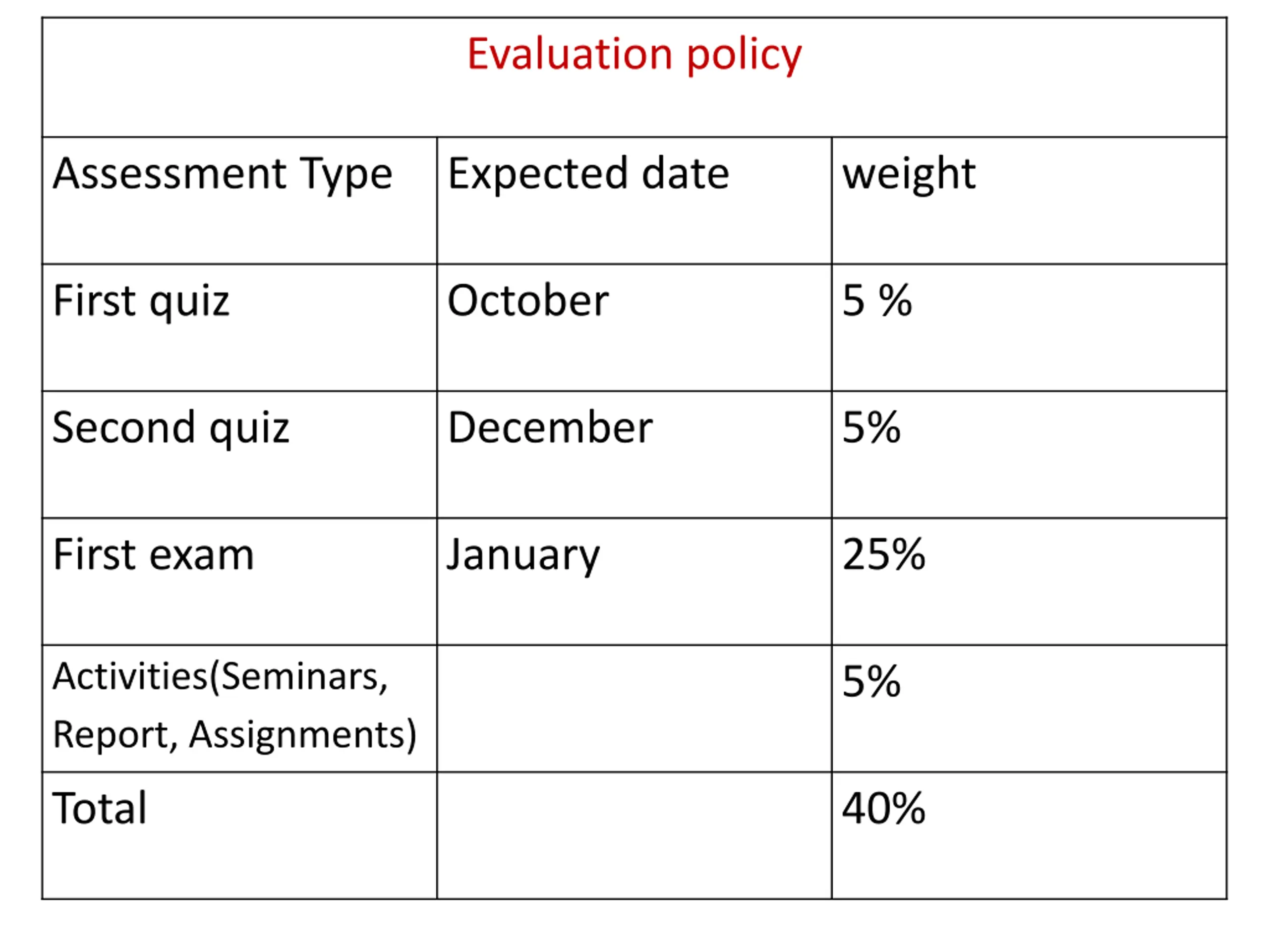 Evaluation policy Assessment Type Expected date weight First quiz October 5 % Second quiz December 5% First exam January 25% Activities(Seminars, Report, Assignments) 5% Total 40%