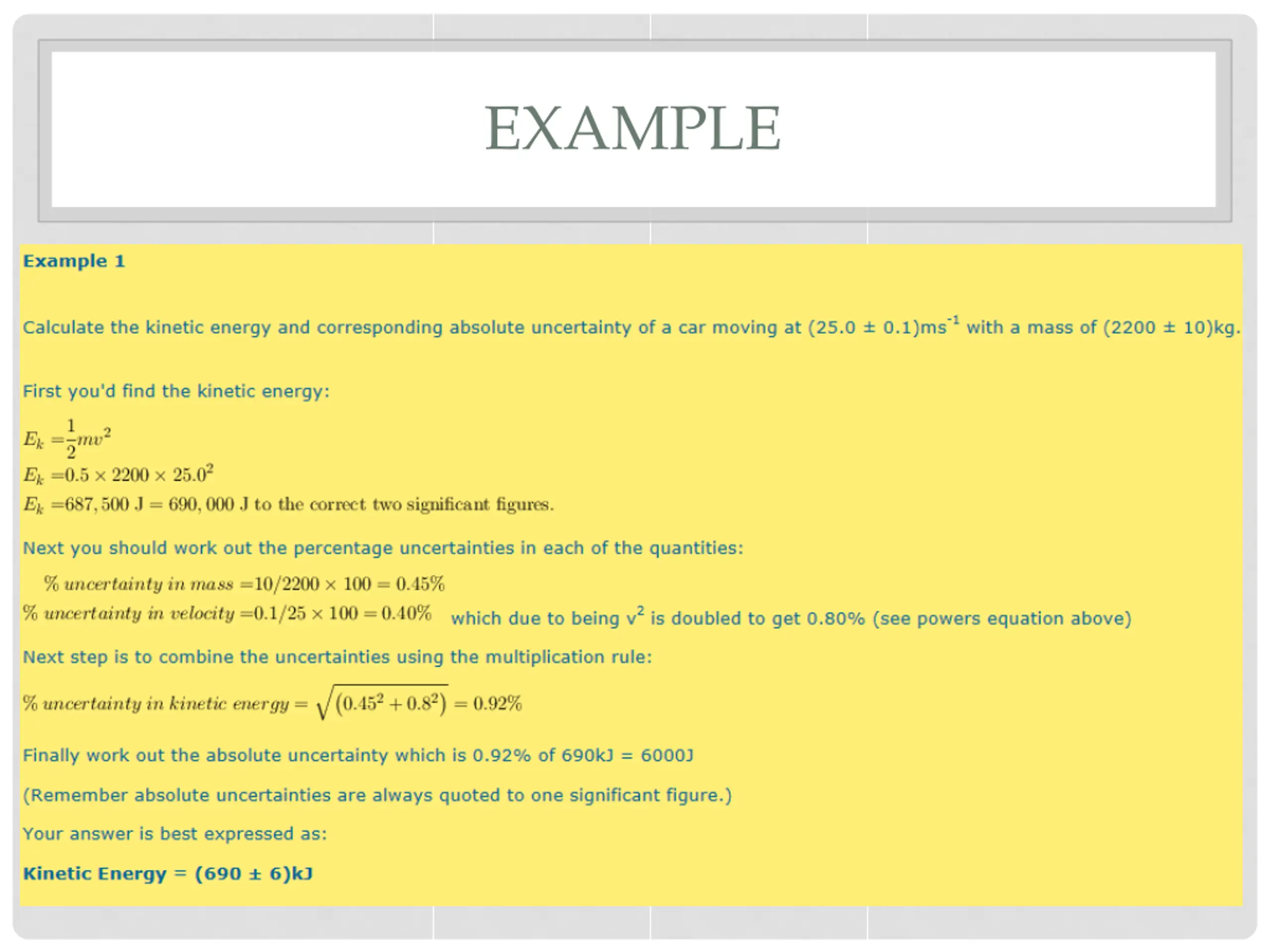 COMBINING UNCERTAINTIES Multiplication and division When two quantities P with absolute uncertainty P, and Q with absolute uncertainty Q, are multiplied or divided to give a further quantity S, the percentage uncertainty in S is given by:
