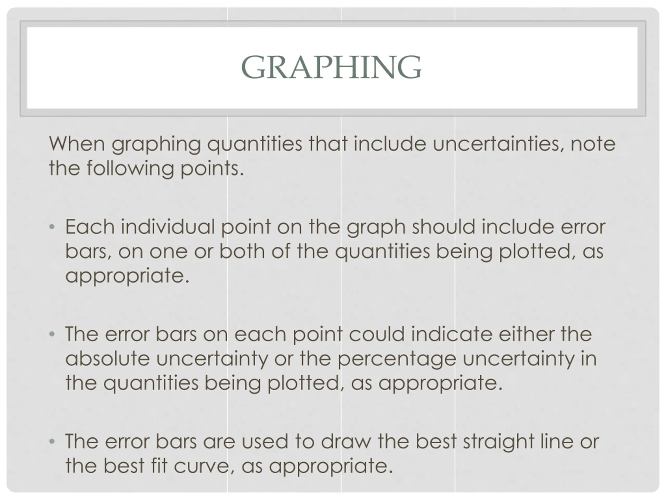 GRAPHING When graphing quantities that include uncertainties, note the following points. Each individual point on the graph should include error bars, on one or both of the quantities being plotted, as appropriate. The error bars on each point could indicate either the absolute uncertainty or the percentage uncertainty in the quantities being plotted, as appropriate. The error bars are used to draw the best straight line or the best fit curve, as appropriate.
