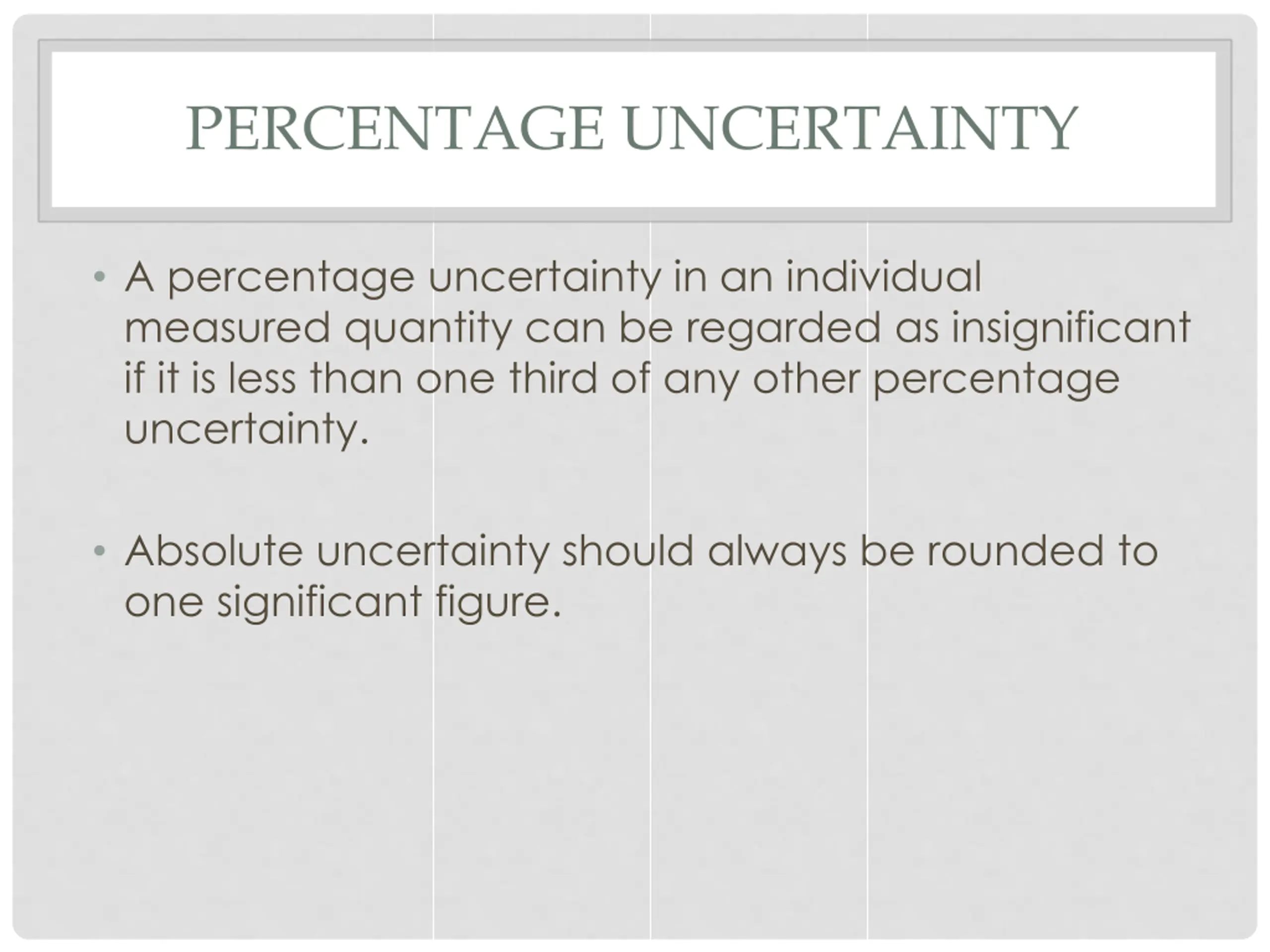 PERCENTAGE UNCERTAINTY A percentage uncertainty in an individual measured quantity can be regarded as insignificant if it is less than one third of any other percentage uncertainty. Absolute uncertainty should always be rounded to one significant figure.