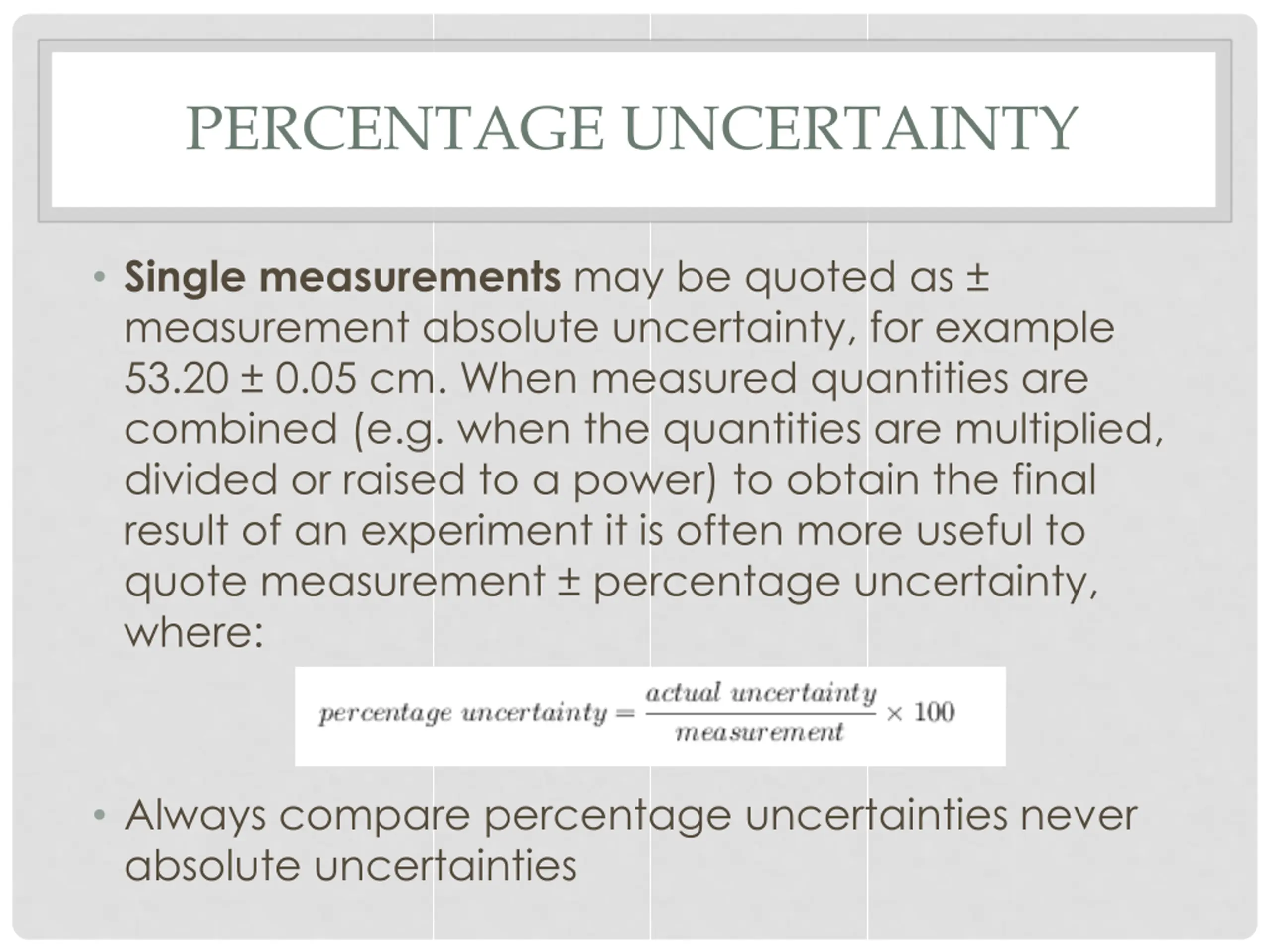 PERCENTAGE UNCERTAINTY Single measurements may be quoted as measurement absolute uncertainty, for example 53.20 0.05 cm. When measured quantities are combined (e.g. when the quantities are multiplied, divided or raised to a power) to obtain the final result of an experiment it is often more useful to quote measurement percentage uncertainty, where: Always compare percentage uncertainties never absolute uncertainties