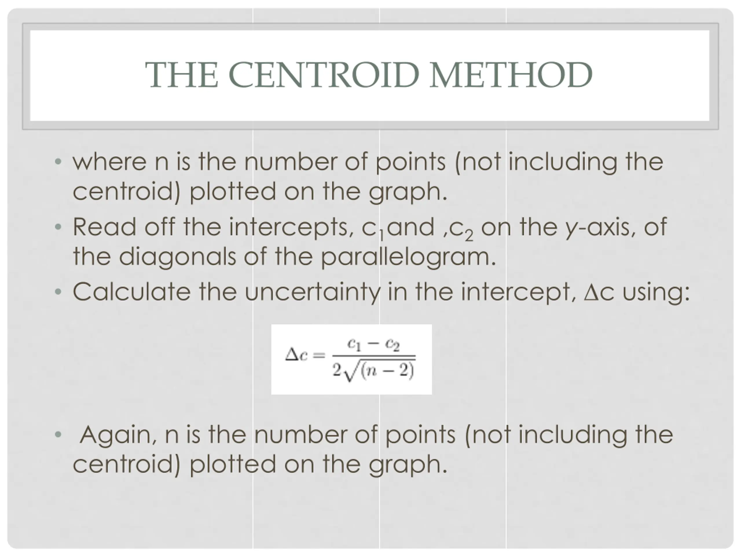 THE CENTROID METHOD where n is the number of points (not including the centroid) plotted on the graph. Read off the intercepts, c1and ,c2on the y-axis, of the diagonals of the parallelogram. Calculate the uncertainty in the intercept, c using: Again, n is the number of points (not including the centroid) plotted on the graph.