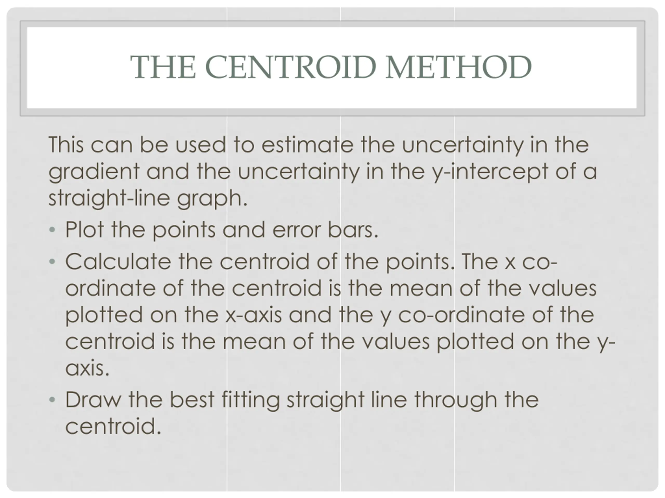 THE CENTROID METHOD This can be used to estimate the uncertainty in the gradient and the uncertainty in the y-intercept of a straight-line graph. Plot the points and error bars. Calculate the centroid of the points. The x co- ordinate of the centroid is the mean of the values plotted on the x-axis and the y co-ordinate of the centroid is the mean of the values plotted on the y- axis. Draw the best fitting straight line through the centroid.
