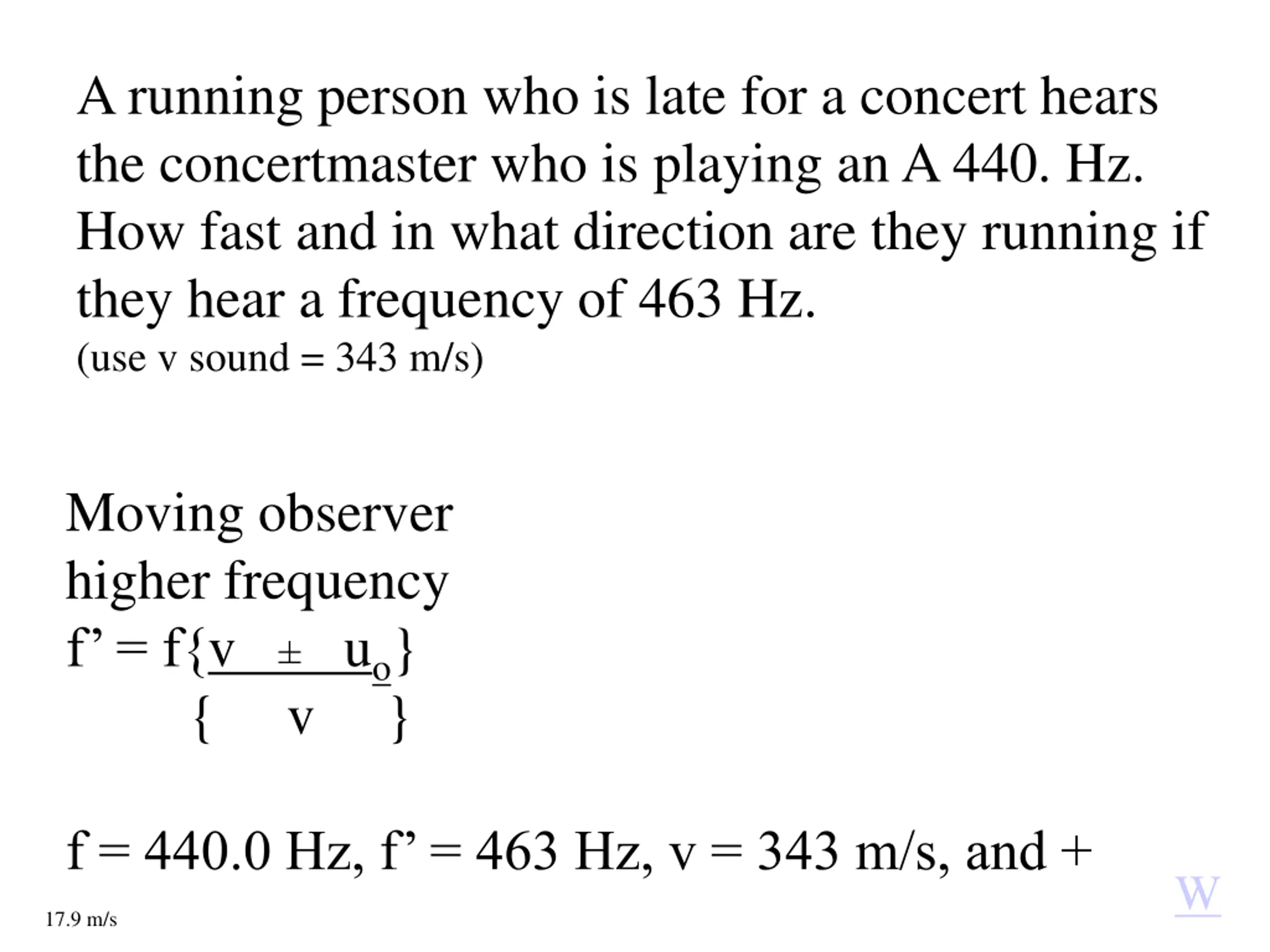 A running person who is late for a concert hears the concertmaster who is playing an A 440. Hz. How fast and in what direction are they running if they hear a frequency of 463 Hz. (use v sound = 343 m/s) Moving observer higher frequency f = f{v uo} { v } f = 440.0 Hz, f = 463 Hz, v = 343 m/s, and + W 17.9 m/s