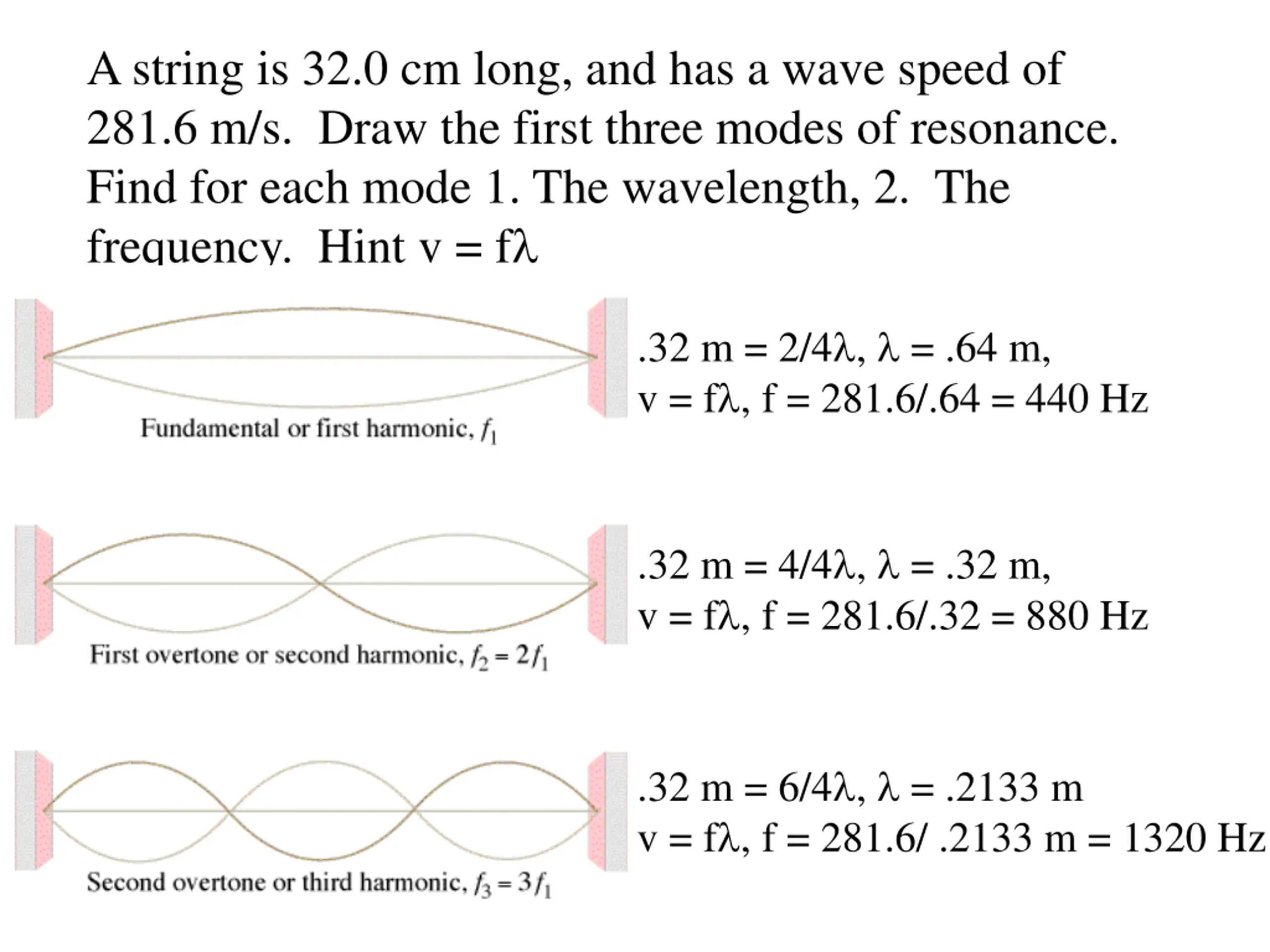 A string is 32.0 cm long, and has a wave speed of 281.6 m/s. Draw the first three modes of resonance. Find for each mode 1. The wavelength, 2. The frequency. Hint v = f .32 m = 2/4 , = .64 m, v = f , f = 281.6/.64 = 440 Hz .32 m = 4/4 , = .32 m, v = f , f = 281.6/.32 = 880 Hz .32 m = 6/4 , = .2133 m v = f , f = 281.6/ .2133 m = 1320 Hz