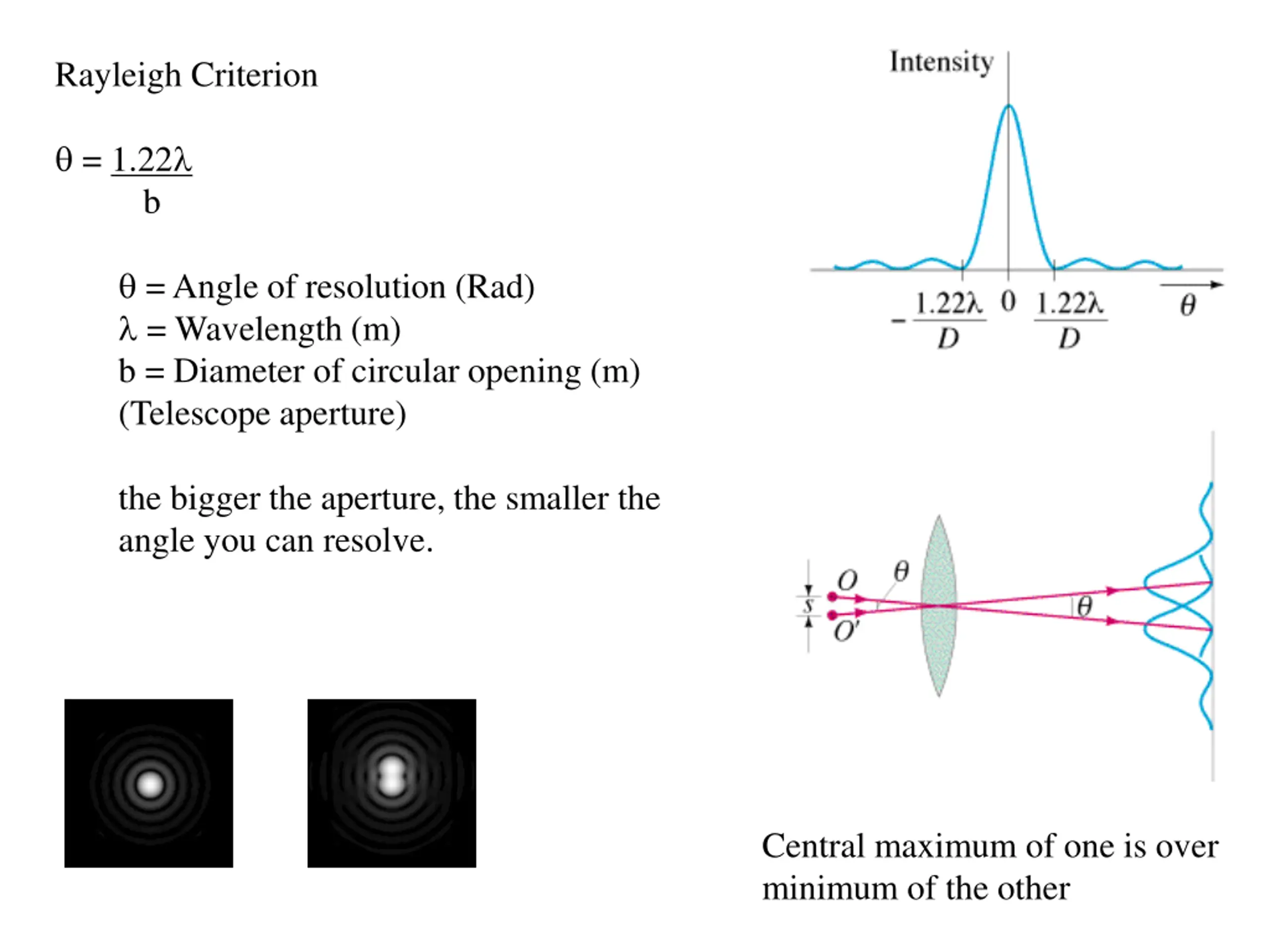 Rayleigh Criterion = 1.22 b = Angle of resolution (Rad) = Wavelength (m) b = Diameter of circular opening (m) (Telescope aperture) the bigger the aperture, the smaller the angle you can resolve. Central maximum of one is over minimum of the other