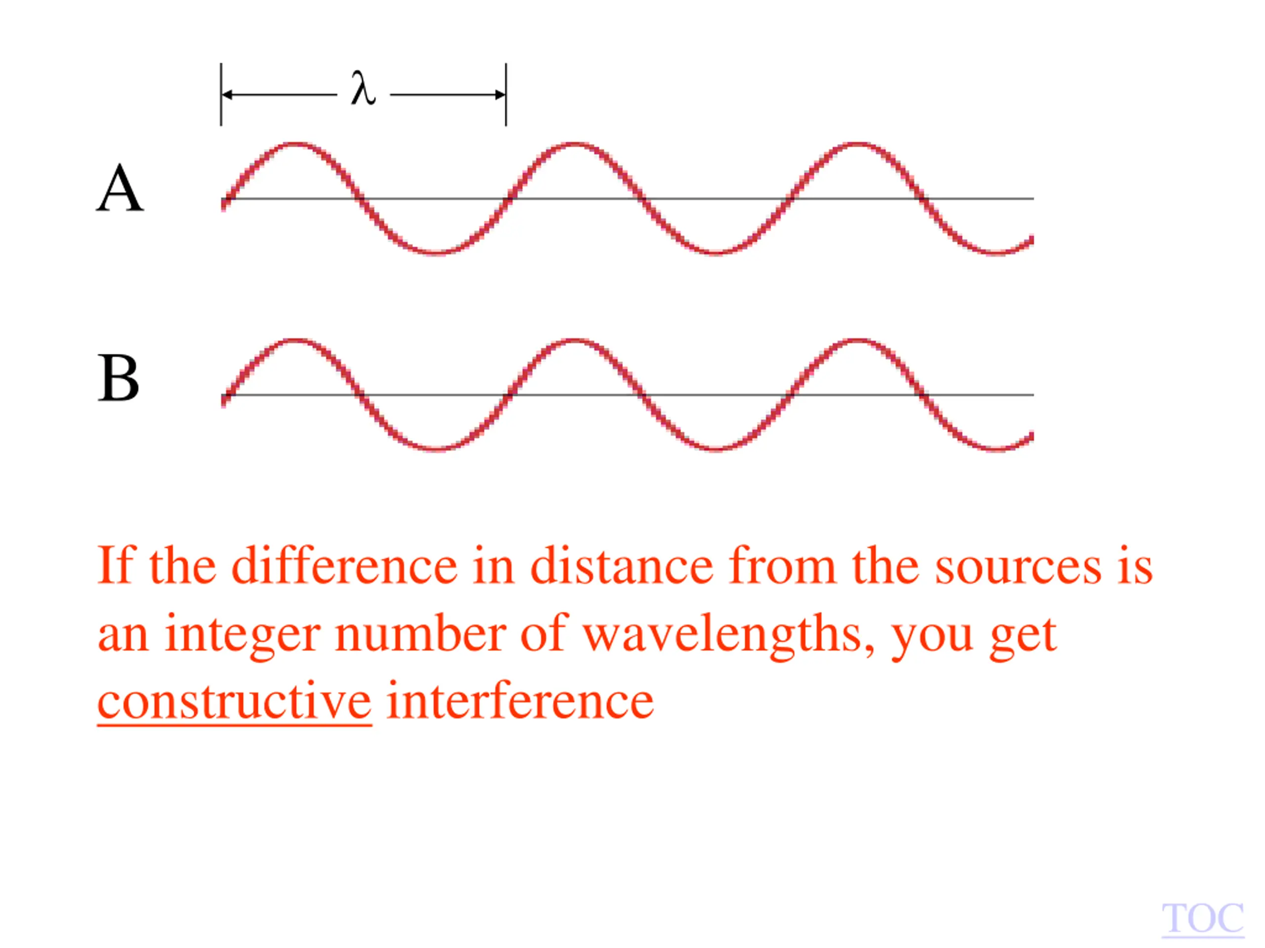A B If the difference in distance from the sources is an integer number of wavelengths, you get constructive interference Difference is: 0 , 1 , 2 , 3 TOC