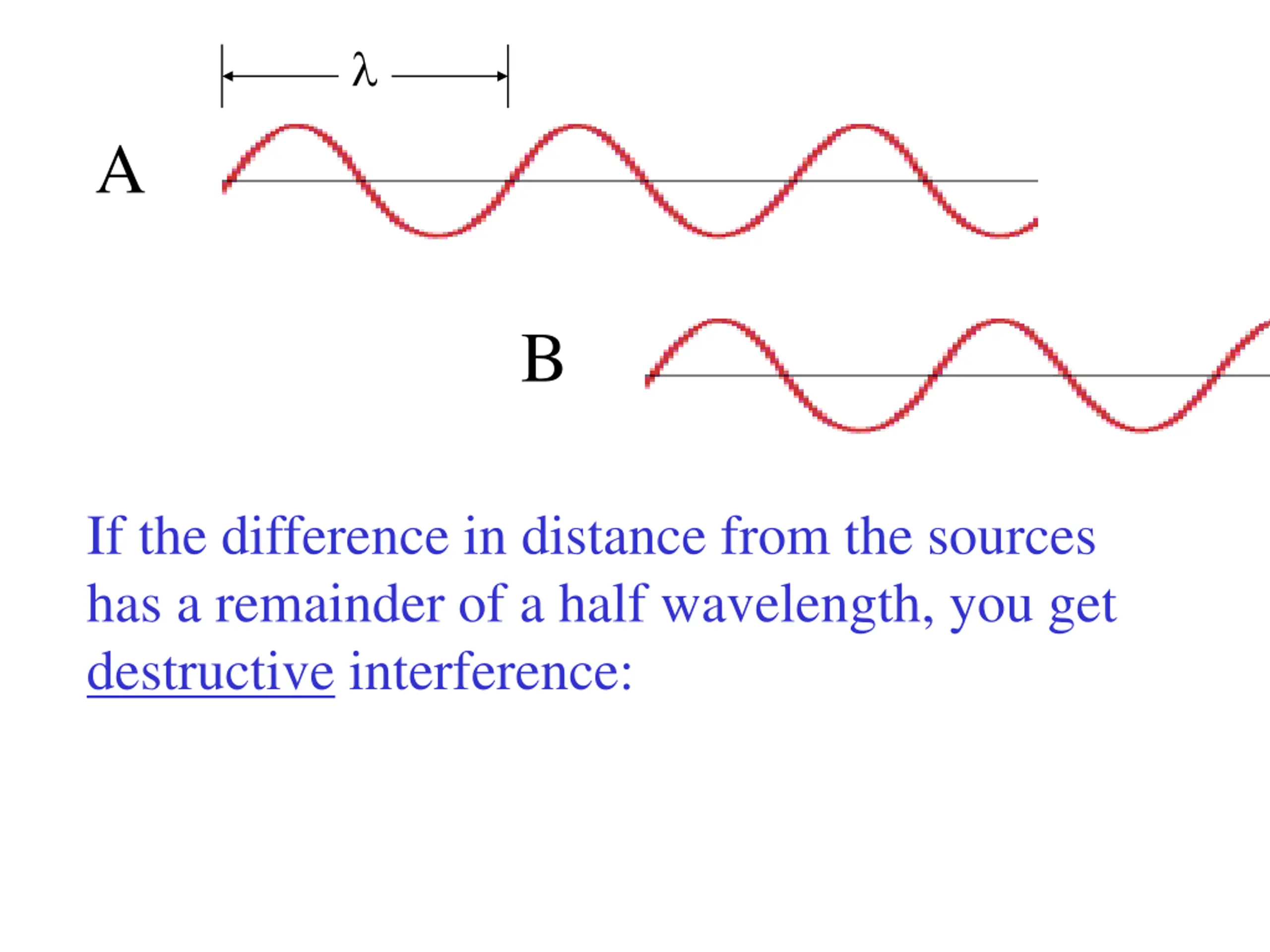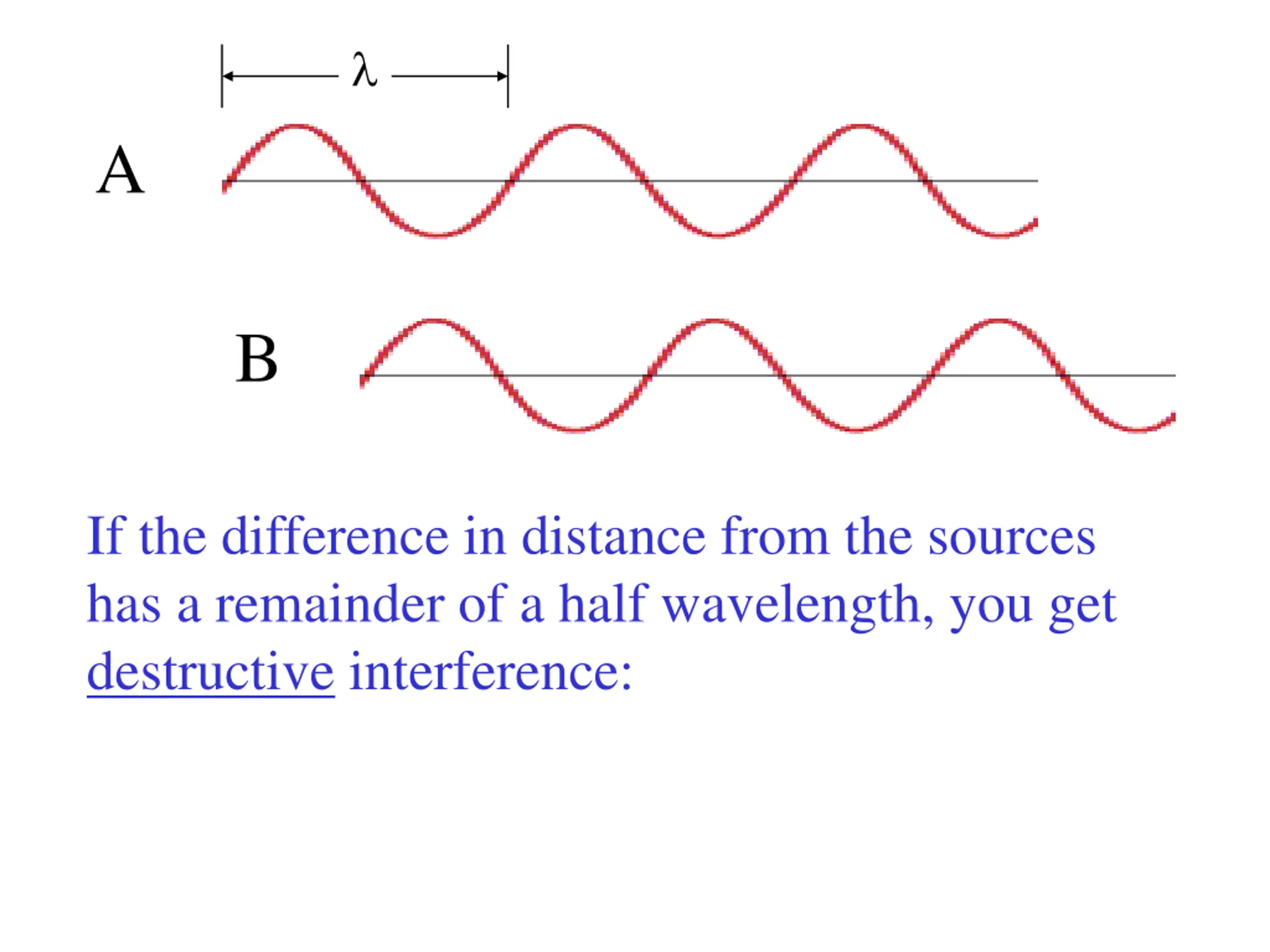 A B If the difference in distance from the sources has a remainder of a half wavelength, you get destructive interference: Difference .5 , 1.5 , 2.5 , 3.5