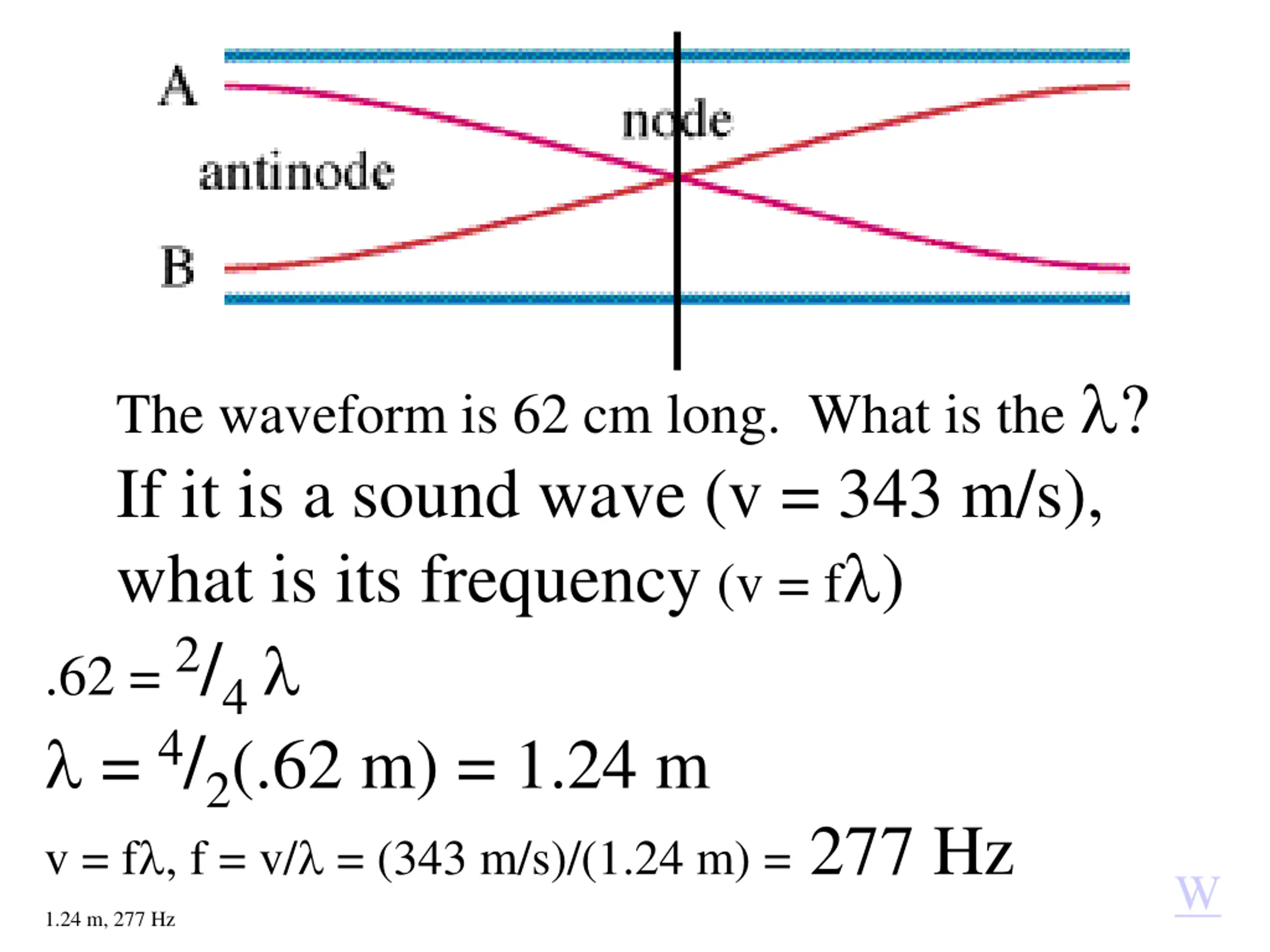 The waveform is 62 cm long. What is the ? If it is a sound wave (v = 343 m/s), what is its frequency (v = f ) .62 = 2/4 = 4/2(.62 m) = 1.24 m v = f , f = v/ = (343 m/s)/(1.24 m) = 277 Hz W 1.24 m, 277 Hz