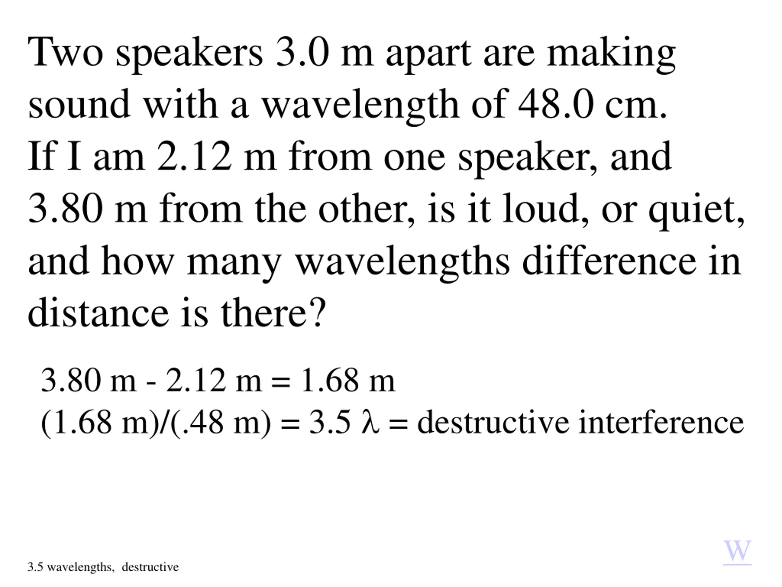 Two speakers 3.0 m apart are making sound with a wavelength of 48.0 cm. If I am 2.12 m from one speaker, and 3.80 m from the other, is it loud, or quiet, and how many wavelengths difference in distance is there? 3.80 m - 2.12 m = 1.68 m (1.68 m)/(.48 m) = 3.5 = destructive interference W 3.5 wavelengths, destructive