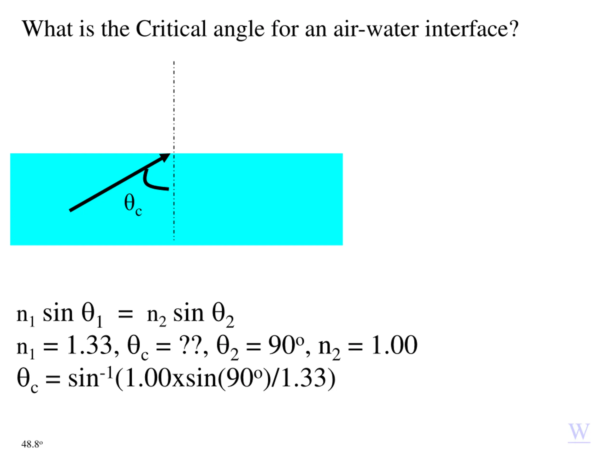 What is the Critical angle for an air-water interface? c n1sin 1 = n2sin 2 n1 = 1.33, c = ??, 2 = 90o, n2 = 1.00 c = sin-1(1.00xsin(90o)/1.33) W 48.8o