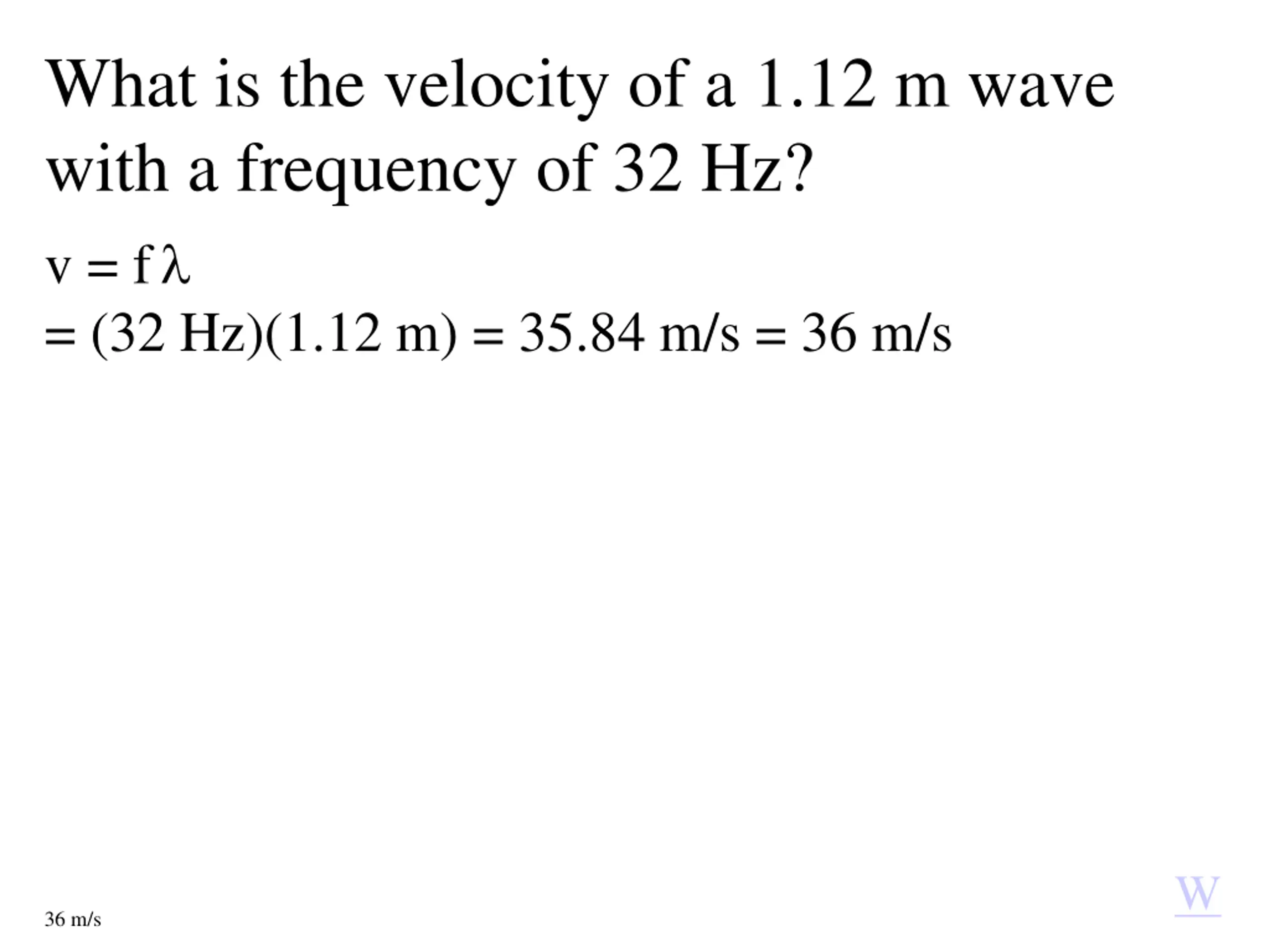 What is the velocity of a 1.12 m wave with a frequency of 32 Hz? v = f = (32 Hz)(1.12 m) = 35.84 m/s = 36 m/s W 36 m/s