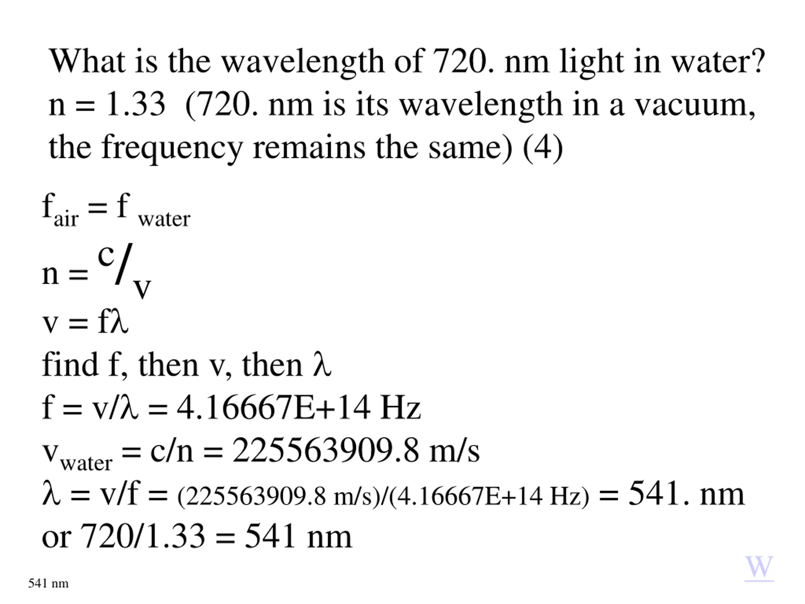 What is the wavelength of 720. nm light in water? n = 1.33 (720. nm is its wavelength in a vacuum, the frequency remains the same) (4) fair = f water n = c/v v = f find f, then v, then f = v/ = 4.16667E+14 Hz vwater = c/n = 225563909.8 m/s = v/f = (225563909.8 m/s)/(4.16667E+14 Hz) = 541. nm or 720/1.33 = 541 nm W 541 nm
