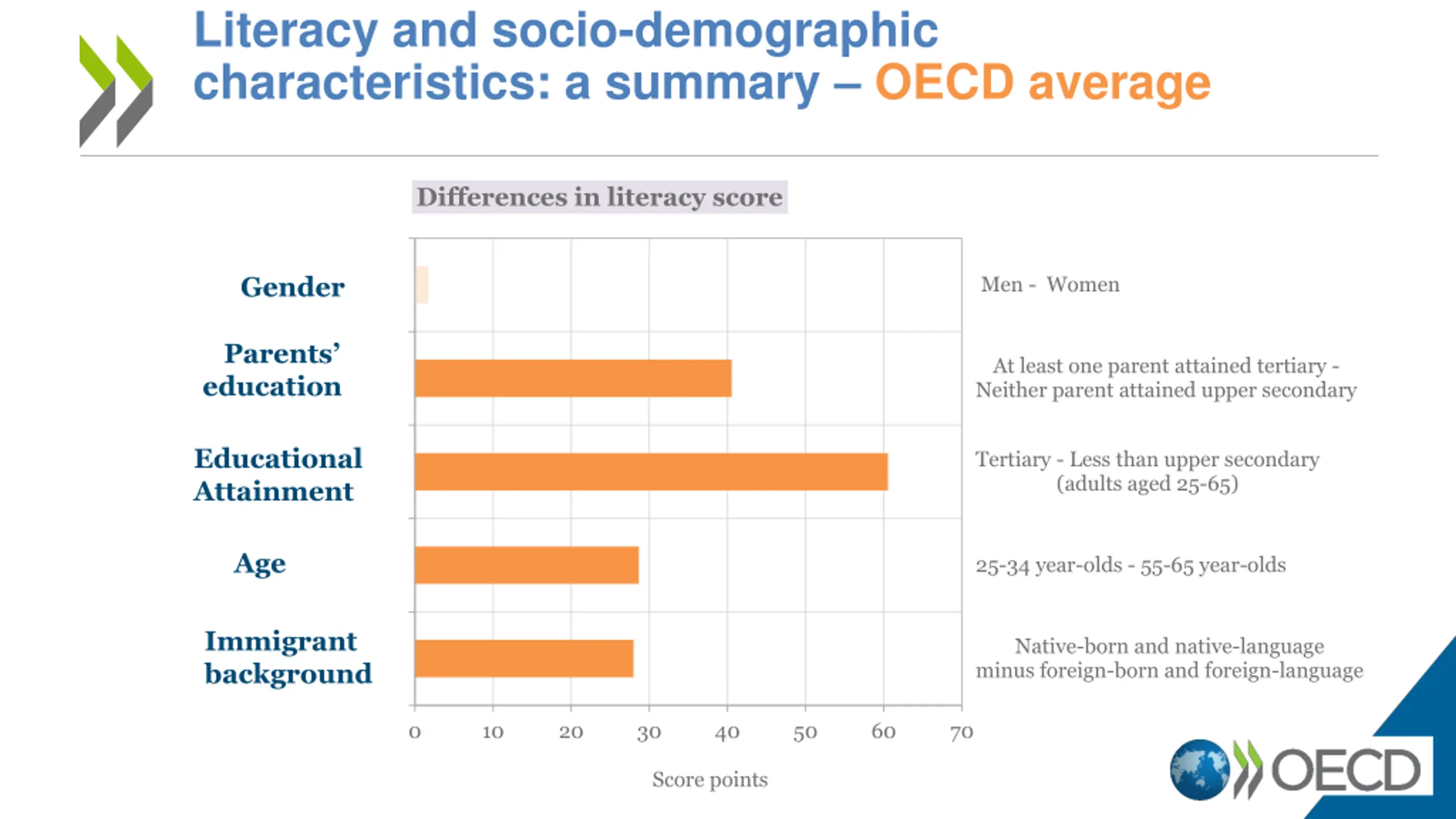 Literacy and socio-demographic characteristics: a summary OECD average Differences in literacy score Gender Men - Women Parents education At least one parent attained tertiary - Neither parent attained upper secondary Educational Attainment Tertiary - Less than upper secondary (adults aged 25-65) Age 25-34 year-olds - 55-65 year-olds Immigrant background Native-born and native-language minus foreign-born and foreign-language 0 10 20 30 40 50 60 70 Score points