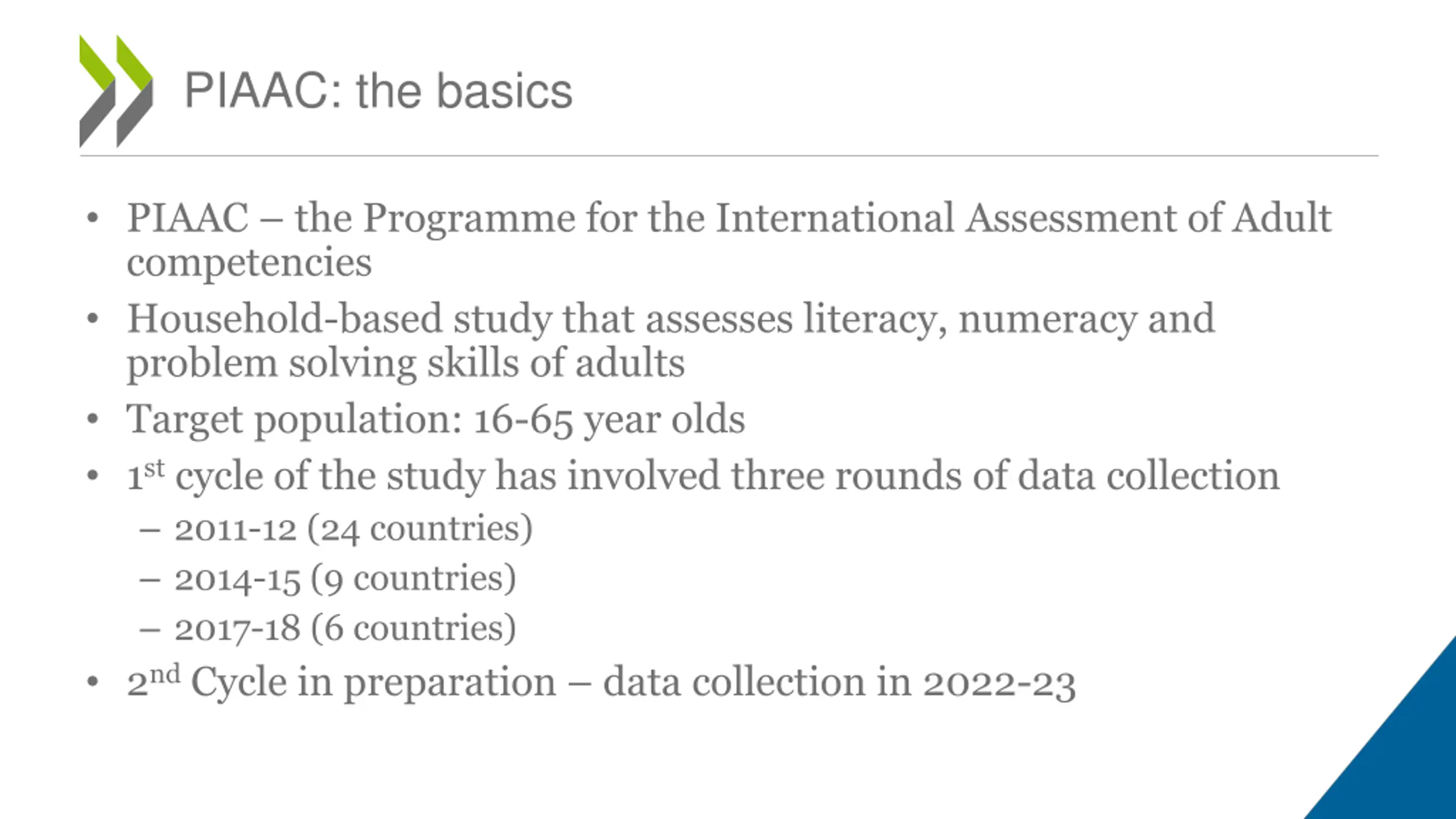 PIAAC: the basics PIAAC the Programme for the International Assessment of Adult competencies Household-based study that assesses literacy, numeracy and problem solving skills of adults Target population: 16-65 year olds 1stcycle of the study has involved three rounds of data collection 2011-12 (24 countries) 2014-15 (9 countries) 2017-18 (6 countries) 2ndCycle in preparation data collection in 2022-23
