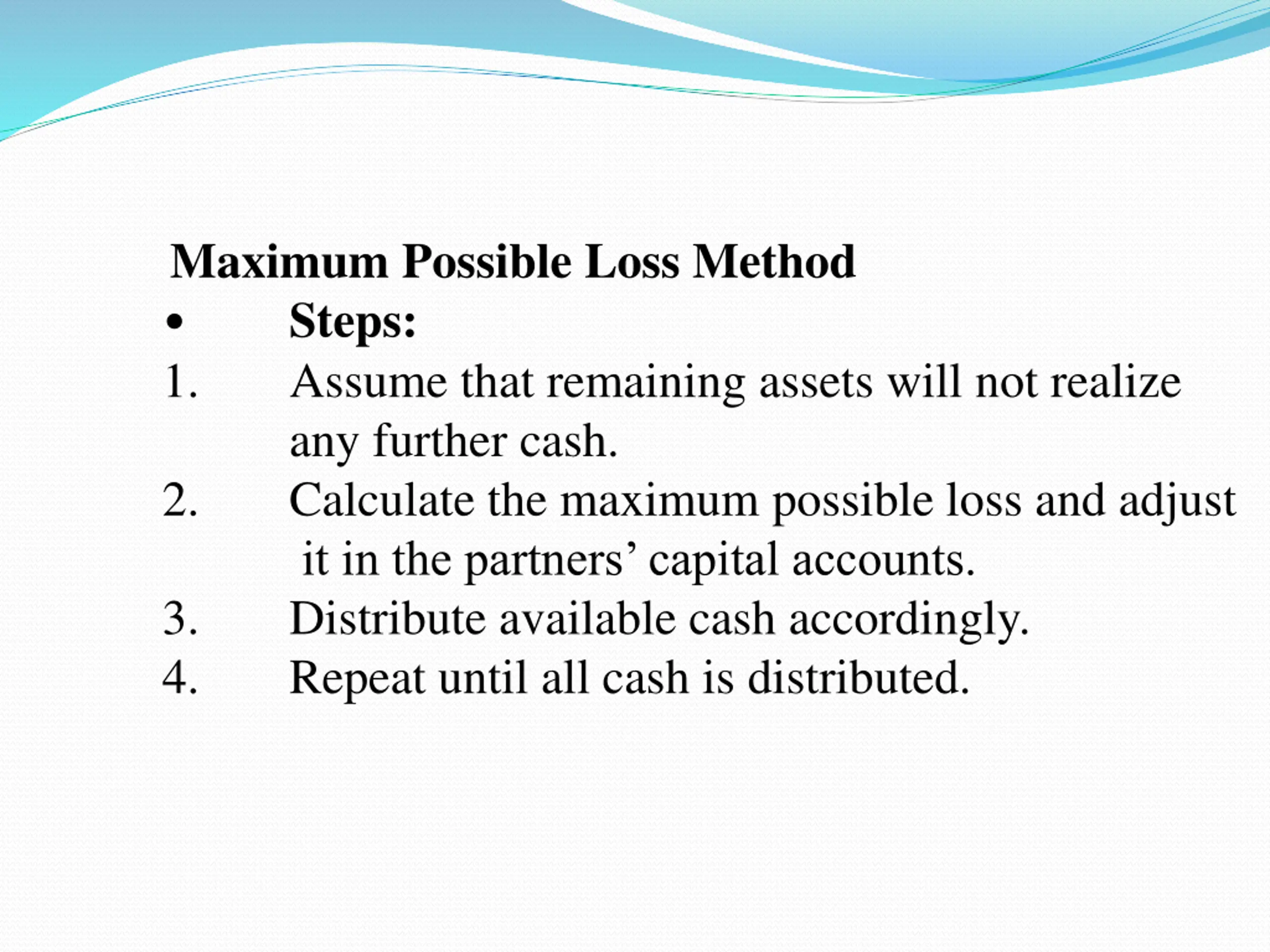Maximum Possible Loss Method Steps: 1. Assume that remaining assets will not realize any further cash. 2. Calculate the maximum possible loss and adjust it in the partners capital accounts. 3. Distribute available cash accordingly. 4. Repeat until all cash is distributed.