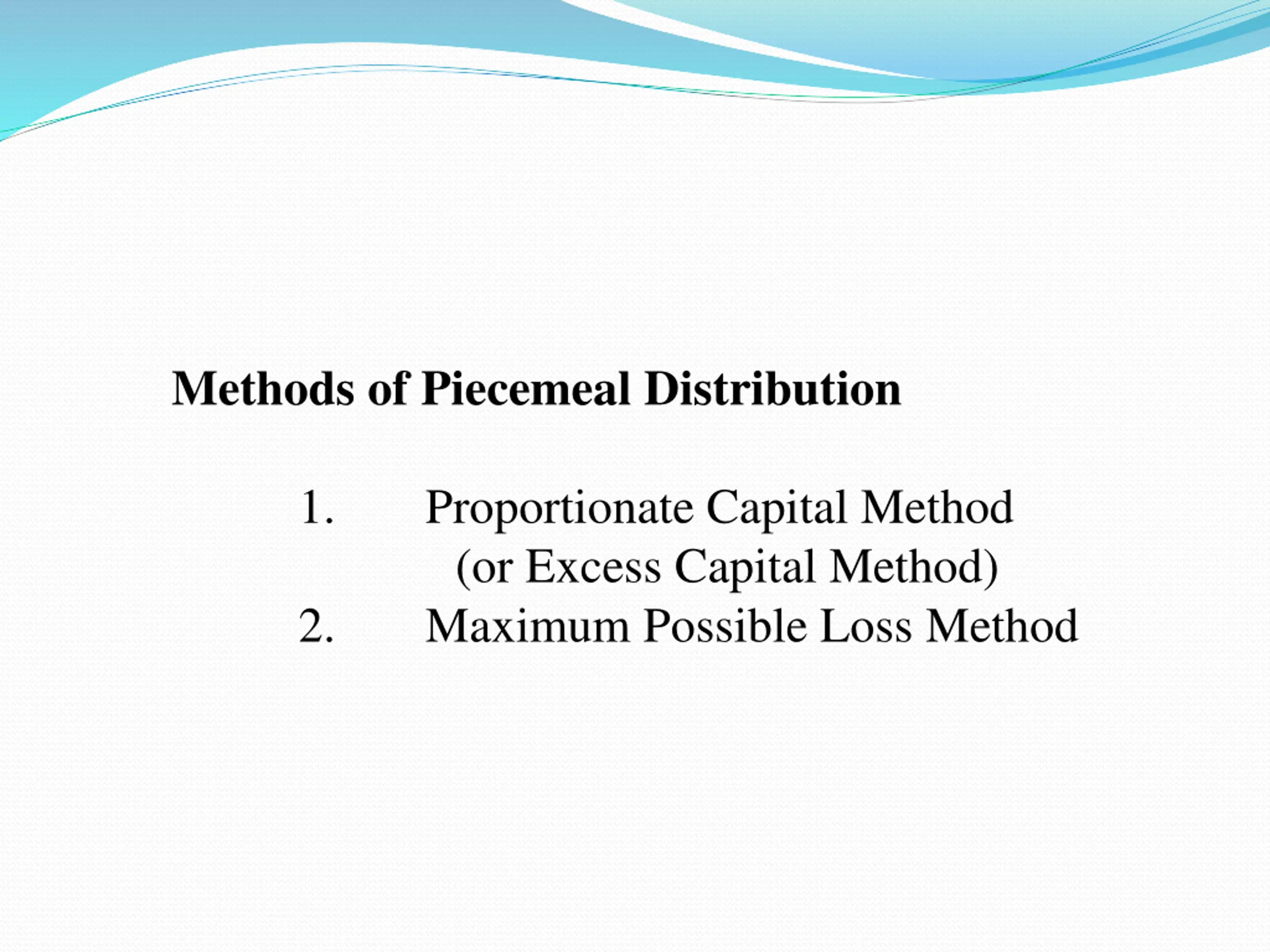 Methods of Piecemeal Distribution (or Excess Capital Method) 2. Maximum Possible Loss Method 1. Proportionate Capital Method