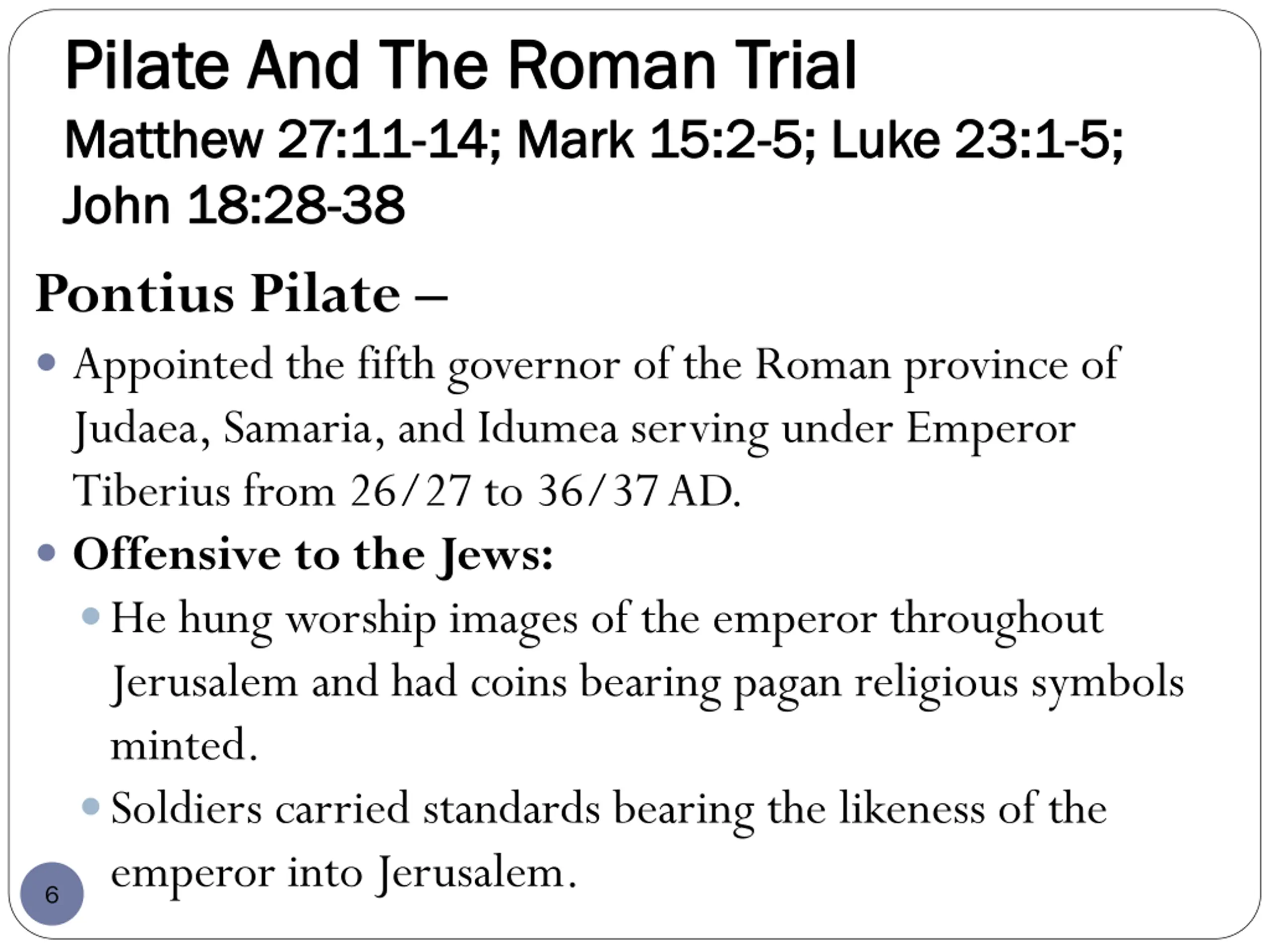 Pilate And The Roman Trial Pilate And The Roman Trial Matthew 27:11 Matthew 27:11- -14; Mark 15:2 14; Mark 15:2- -5; Luke 23:1 John 18:28 John 18:28- -38 38 5; Luke 23:1- -5; 5; Pontius Pilate Appointed the fifth governor of the Roman province of Judaea, Samaria, and Idumea serving under Emperor Tiberius from 26/27 to 36/37 AD. Offensive to the Jews: He hung worship images of the emperor throughout Jerusalem and had coins bearing pagan religious symbols minted. Soldiers carried standards bearing the likeness of the emperor into Jerusalem. 6