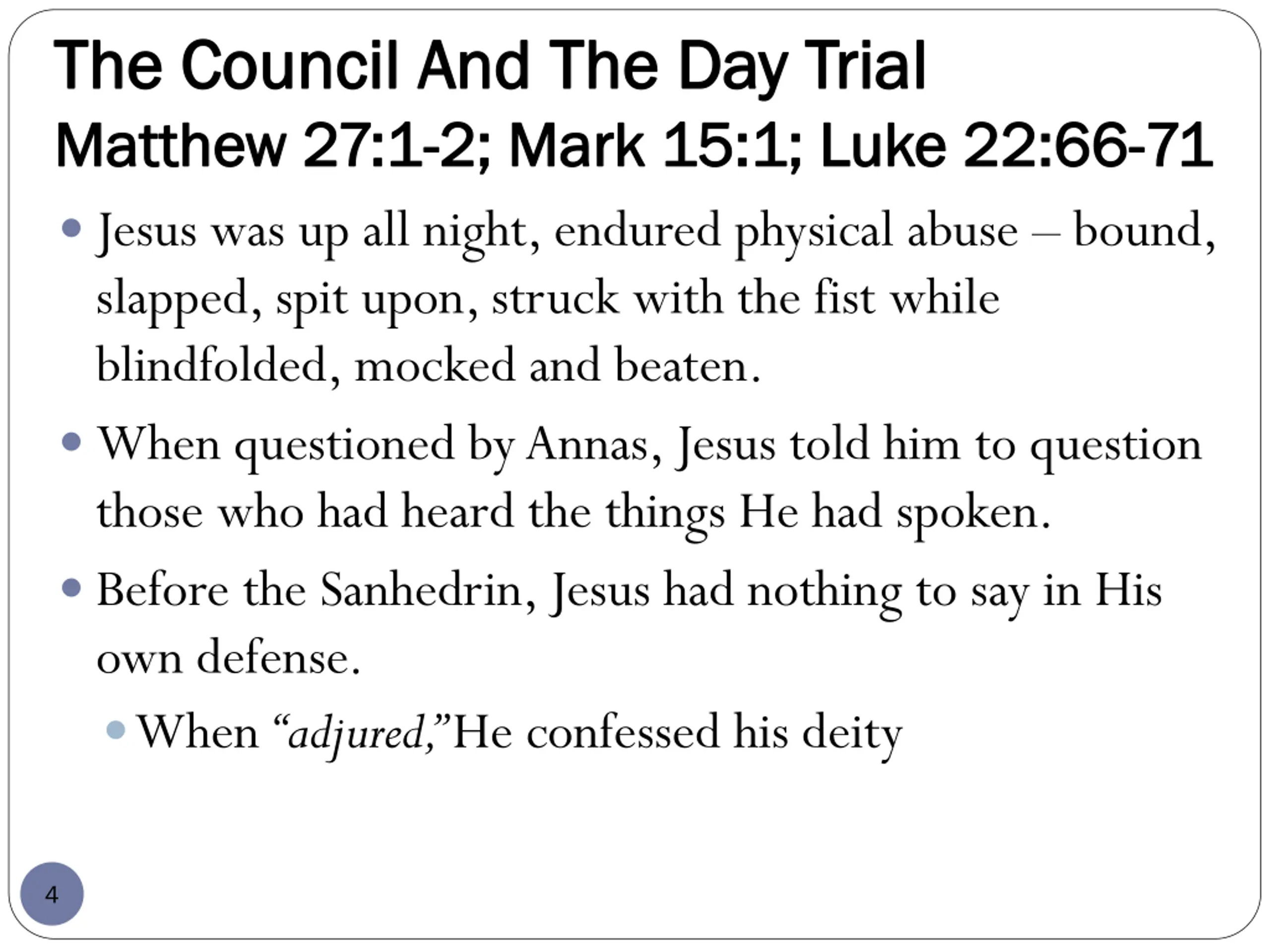 The Council And The Day Trial The Council And The Day Trial Matthew 27:1 Matthew 27:1- -2; Mark 15:1; Luke 22:66 2; Mark 15:1; Luke 22:66- -71 71 Jesus was up all night, endured physical abuse bound, slapped, spit upon, struck with the fist while blindfolded, mocked and beaten. When questioned by Annas, Jesus told him to question those who had heard the things He had spoken. Before the Sanhedrin, Jesus had nothing to say in His own defense. When adjured, He confessed his deity 4