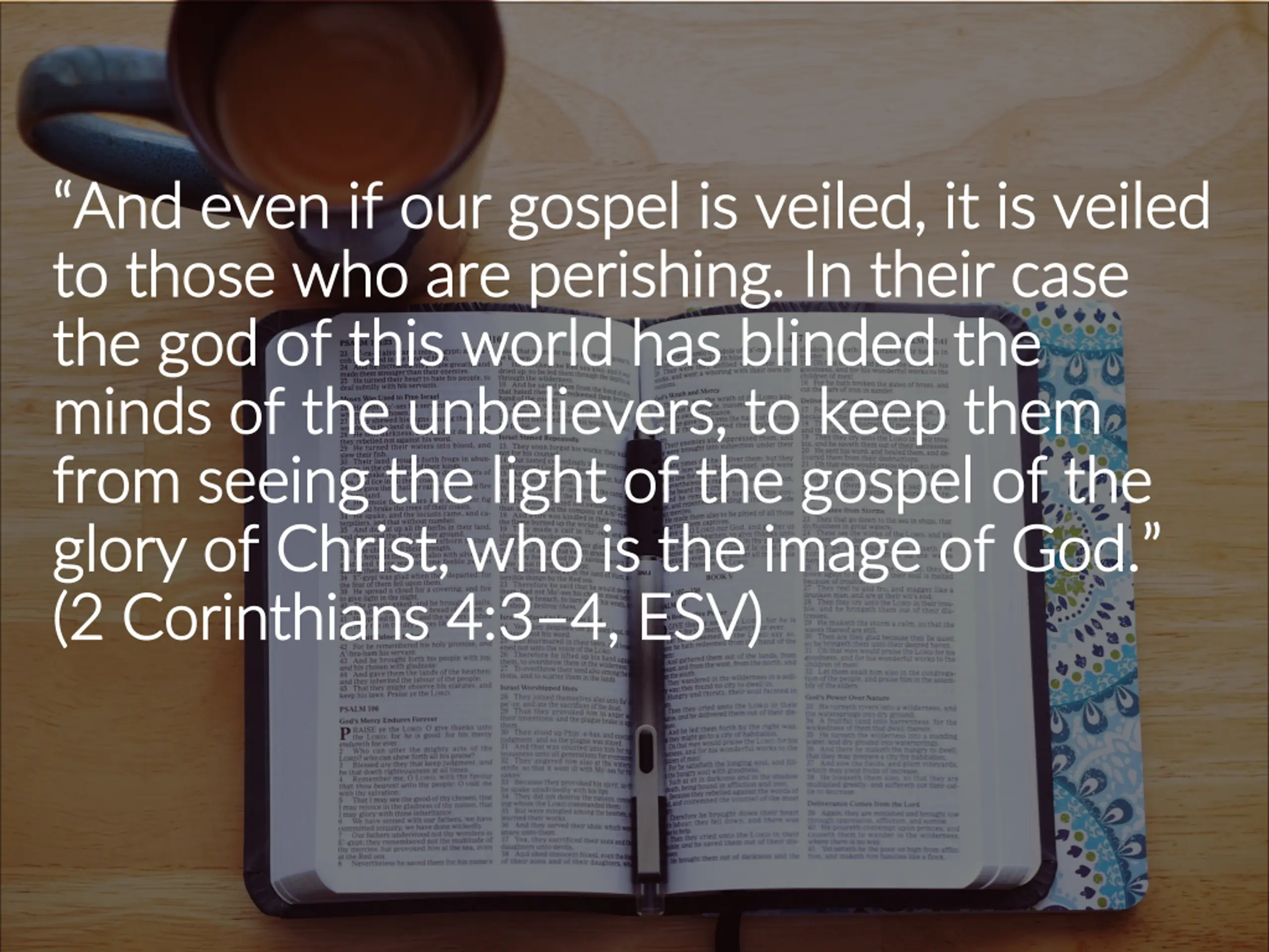 And even if our gospel is veiled, it is veiled And even if our gospel is veiled, it is veiled to those who are perishing. In their case to those who are perishing. In their case the god of this world has blinded the the god of this world has blinded the minds of the unbelievers, to keep them minds of the unbelievers, to keep them from seeing the light of the gospel of the from seeing the light of the gospel of the glory of Christ, who is the image of God. glory of Christ, who is the image of God. (2 Corinthians 4:3 (2 Corinthians 4:3 4, ESV) 4, ESV)