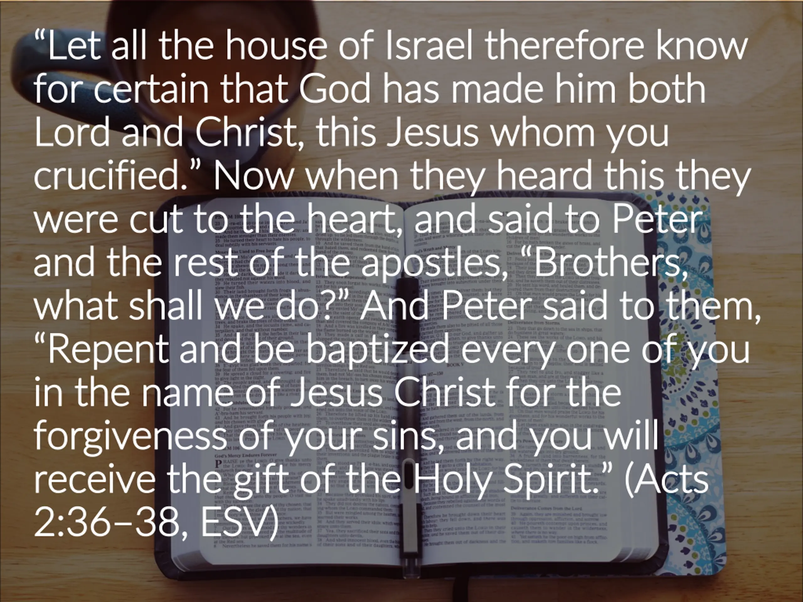 Let all the house of Israel therefore know Let all the house of Israel therefore know for certain that God has made him both for certain that God has made him both Lord and Christ, this Jesus whom you Lord and Christ, this Jesus whom you crucified. Now when they heard this they crucified. Now when they heard this they were cut to the heart, and said to Peter were cut to the heart, and said to Peter and the rest of the apostles, Brothers, and the rest of the apostles, Brothers, what shall we do? And Peter said to them, what shall we do? And Peter said to them, Repent and be baptized every one of you Repent and be baptized every one of you in the name of Jesus Christ for the in the name of Jesus Christ for the forgiveness of your sins, and you will forgiveness of your sins, and you will receive the gift of the Holy Spirit. (Acts receive the gift of the Holy Spirit. (Acts 2:36 2:36 38, ESV) 38, ESV)