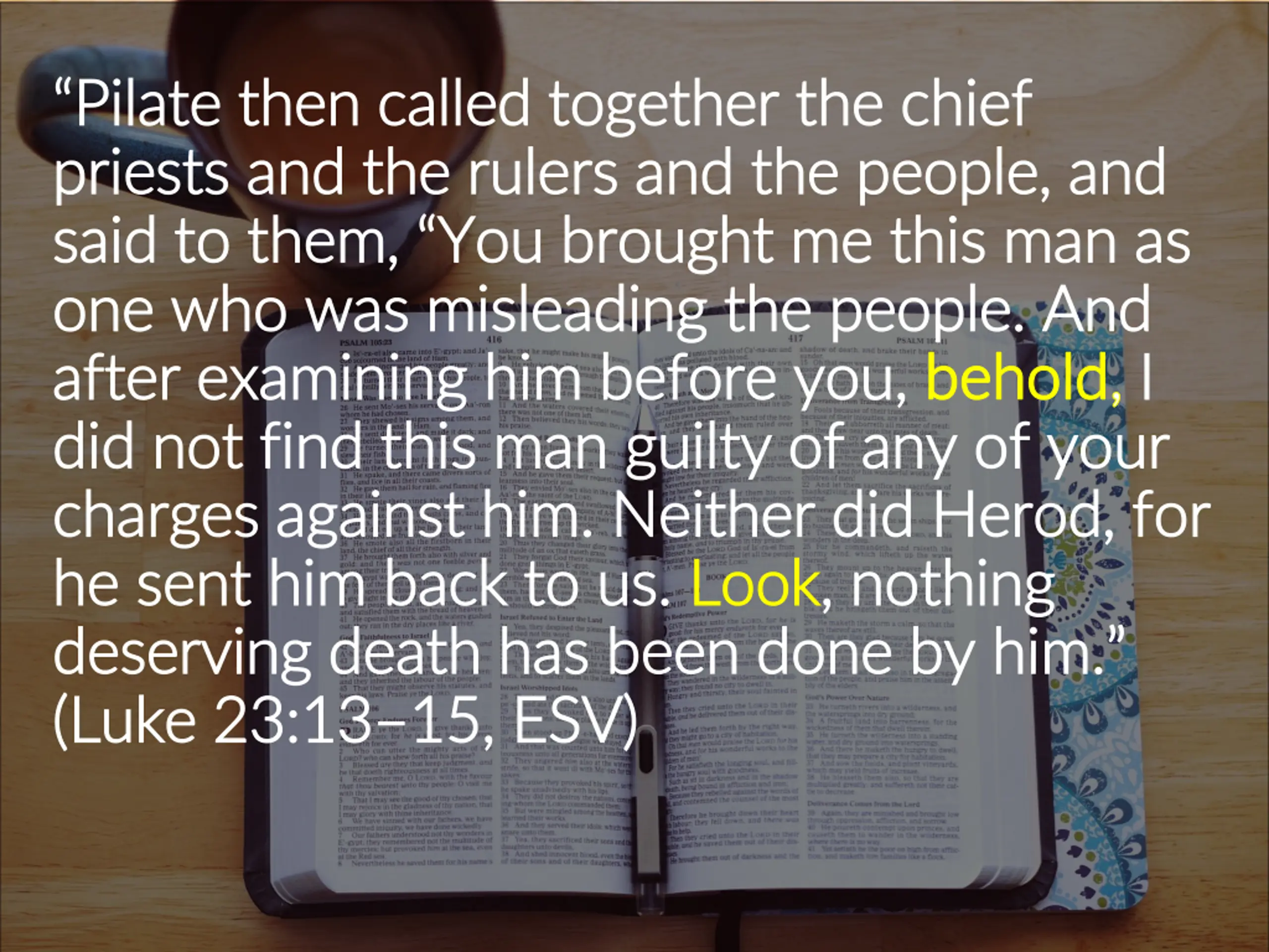 Pilate then called together the chief Pilate then called together the chief priests and the rulers and the people, and priests and the rulers and the people, and said to them, You brought me this man as said to them, You brought me this man as one who was misleading the people. And one who was misleading the people. And after examining him before you, after examining him before you, behold did not find this man guilty of any of your did not find this man guilty of any of your charges against him. Neither did Herod, for charges against him. Neither did Herod, for he sent him back to us. he sent him back to us. Look deserving death has been done by him. deserving death has been done by him. (Luke 23:13 (Luke 23:13 15, ESV) 15, ESV) behold, , I I Look, nothing , nothing