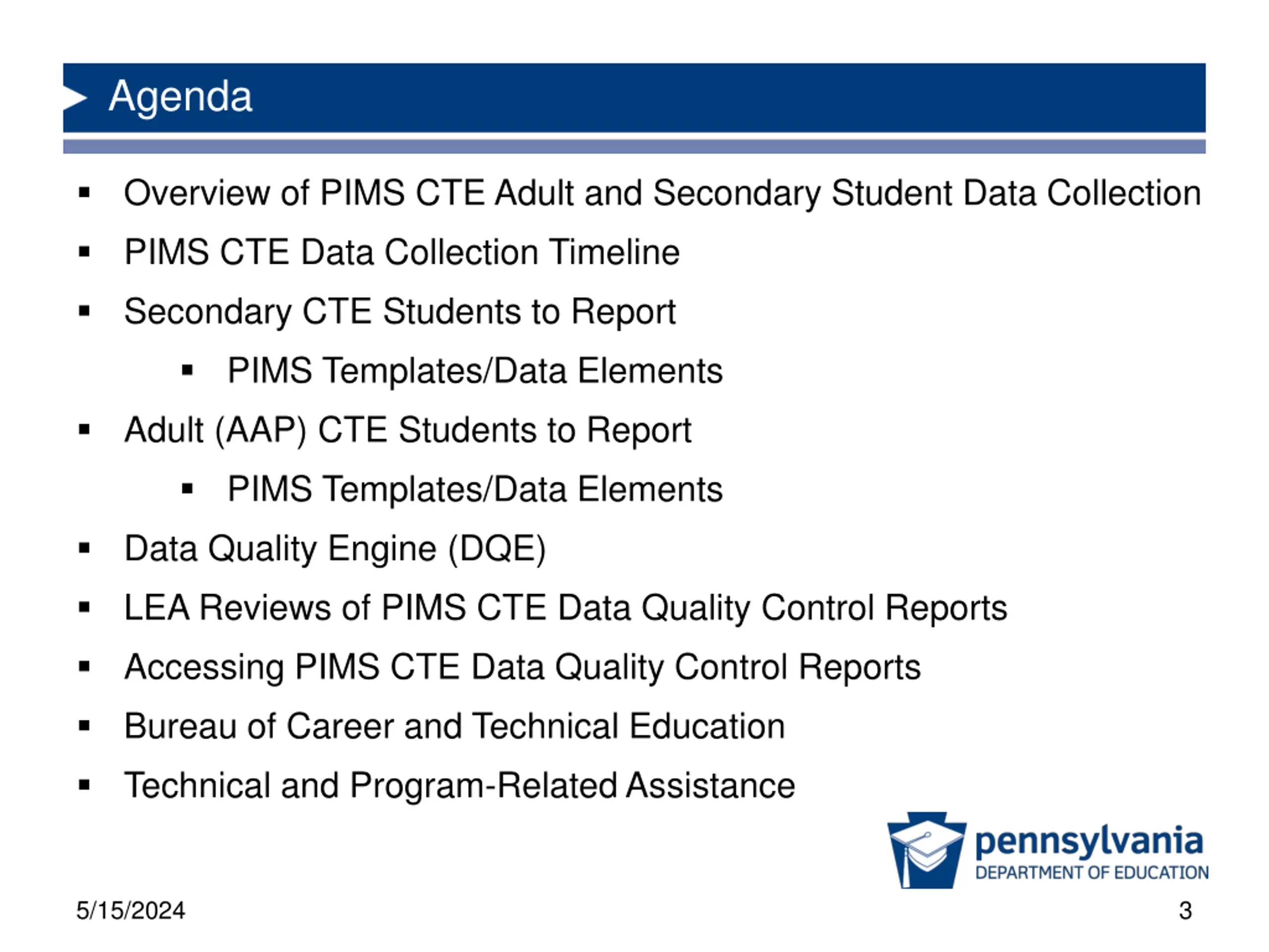 Agenda Overview of PIMS CTE Adult and Secondary Student Data Collection PIMS CTE Data Collection Timeline Secondary CTE Students to Report PIMS Templates/Data Elements Adult (AAP) CTE Students to Report PIMS Templates/Data Elements Data Quality Engine (DQE) LEA Reviews of PIMS CTE Data Quality Control Reports Accessing PIMS CTE Data Quality Control Reports Bureau of Career and Technical Education Technical and Program-Related Assistance 5/15/2024 3