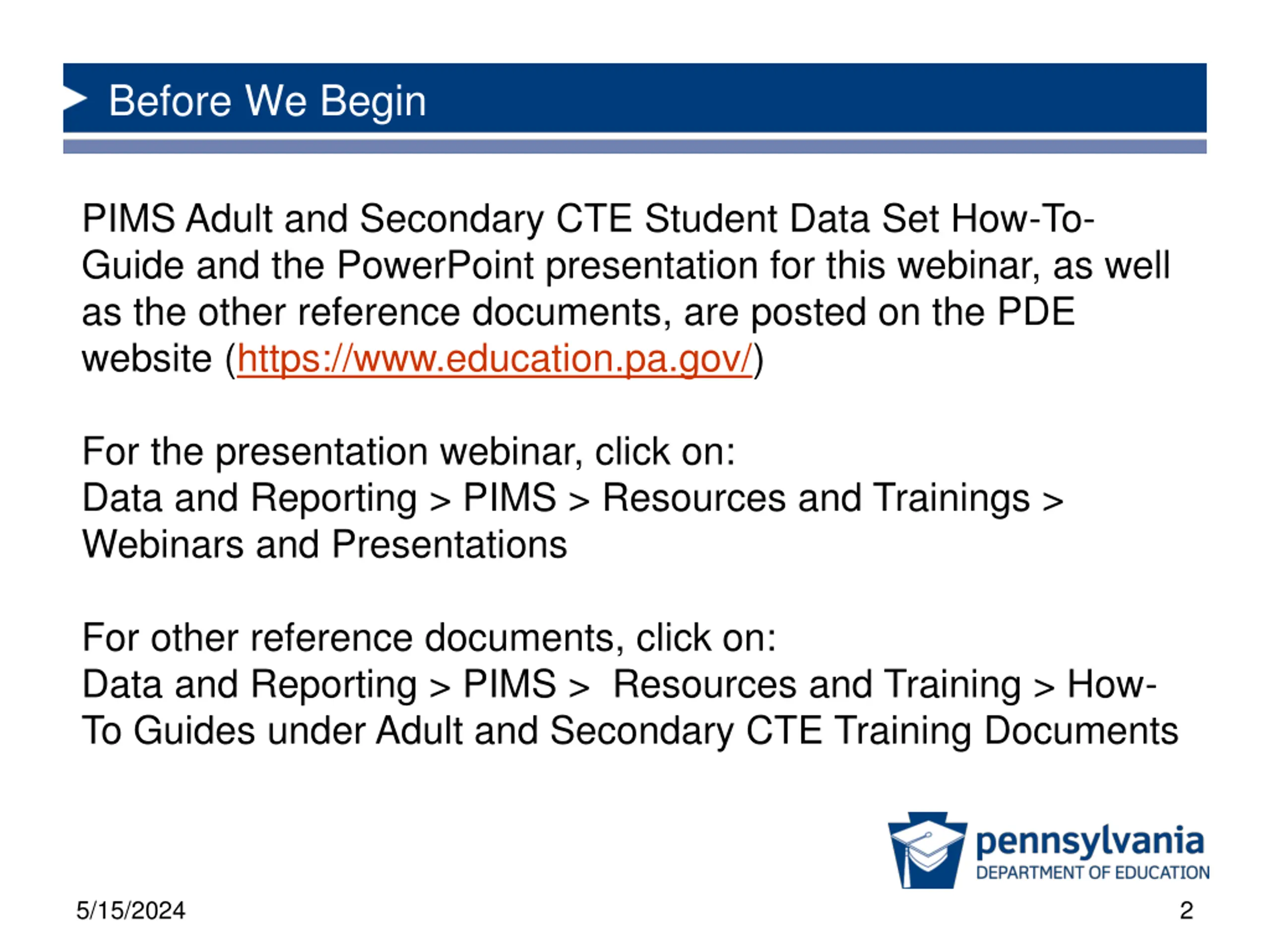 Before We Begin PIMS Adult and Secondary CTE Student Data Set How-To- Guide and the PowerPoint presentation for this webinar, as well as the other reference documents, are posted on the PDE website (https://www.education.pa.gov/) For the presentation webinar, click on: Data and Reporting > PIMS > Resources and Trainings > Webinars and Presentations For other reference documents, click on: Data and Reporting > PIMS > Resources and Training > How- To Guides under Adult and Secondary CTE Training Documents 5/15/2024 2