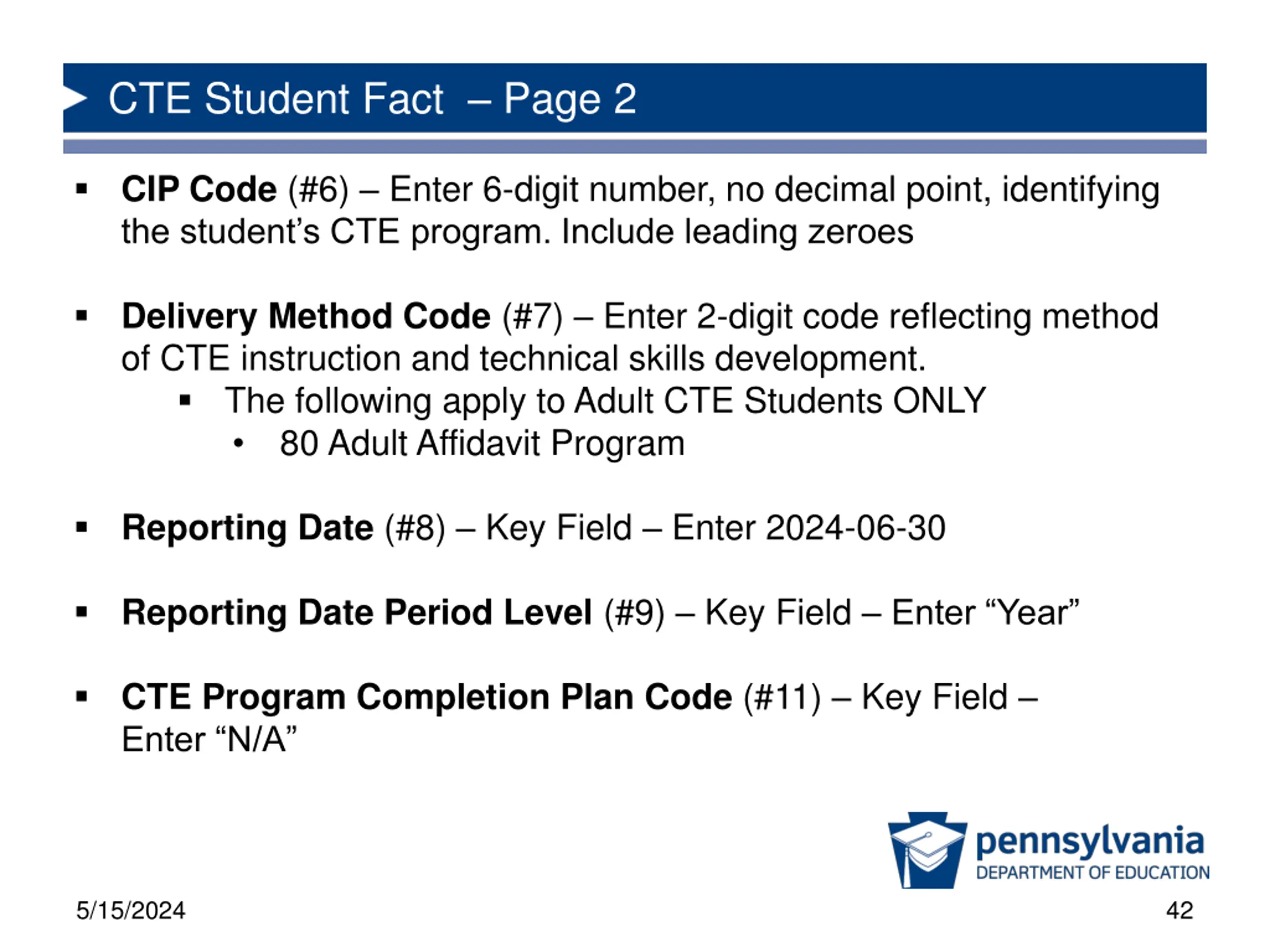 CTE Student Fact Page 2 CIP Code (#6) Enter 6-digit number, no decimal point, identifying the student s CTE program. Include leading zeroes Delivery Method Code (#7) Enter 2-digit code reflecting method of CTE instruction and technical skills development. The following apply to Adult CTE Students ONLY 80 Adult Affidavit Program Reporting Date (#8) Key Field Enter 2024-06-30 Reporting Date Period Level (#9) Key Field Enter Year CTE Program Completion Plan Code (#11) Key Field Enter N/A 5/15/2024 42