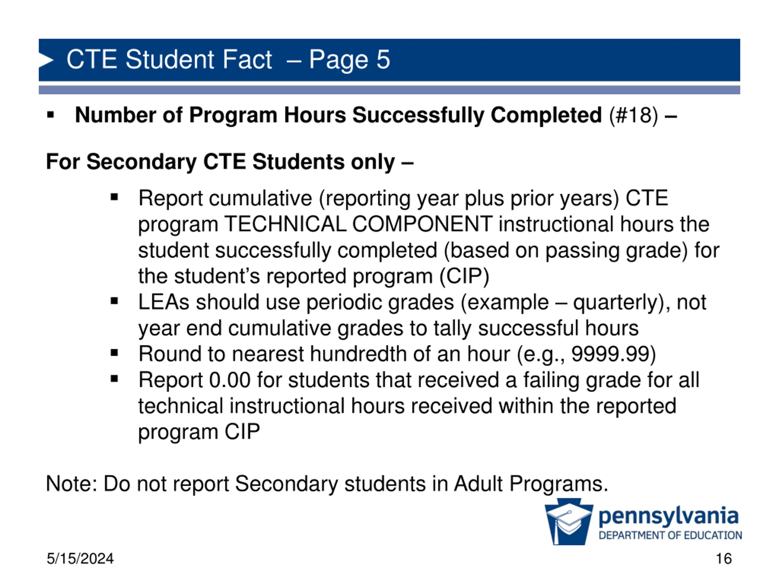 CTE Student Fact Page 5 Number of Program Hours Successfully Completed (#18) For Secondary CTE Students only Report cumulative (reporting year plus prior years) CTE program TECHNICAL COMPONENT instructional hours the student successfully completed (based on passing grade) for the student s reported program (CIP) LEAs should use periodic grades (example quarterly), not year end cumulative grades to tally successful hours Round to nearest hundredth of an hour (e.g., 9999.99) Report 0.00 for students that received a failing grade for all technical instructional hours received within the reported program CIP Note: Do not report Secondary students in Adult Programs. 5/15/2024 16