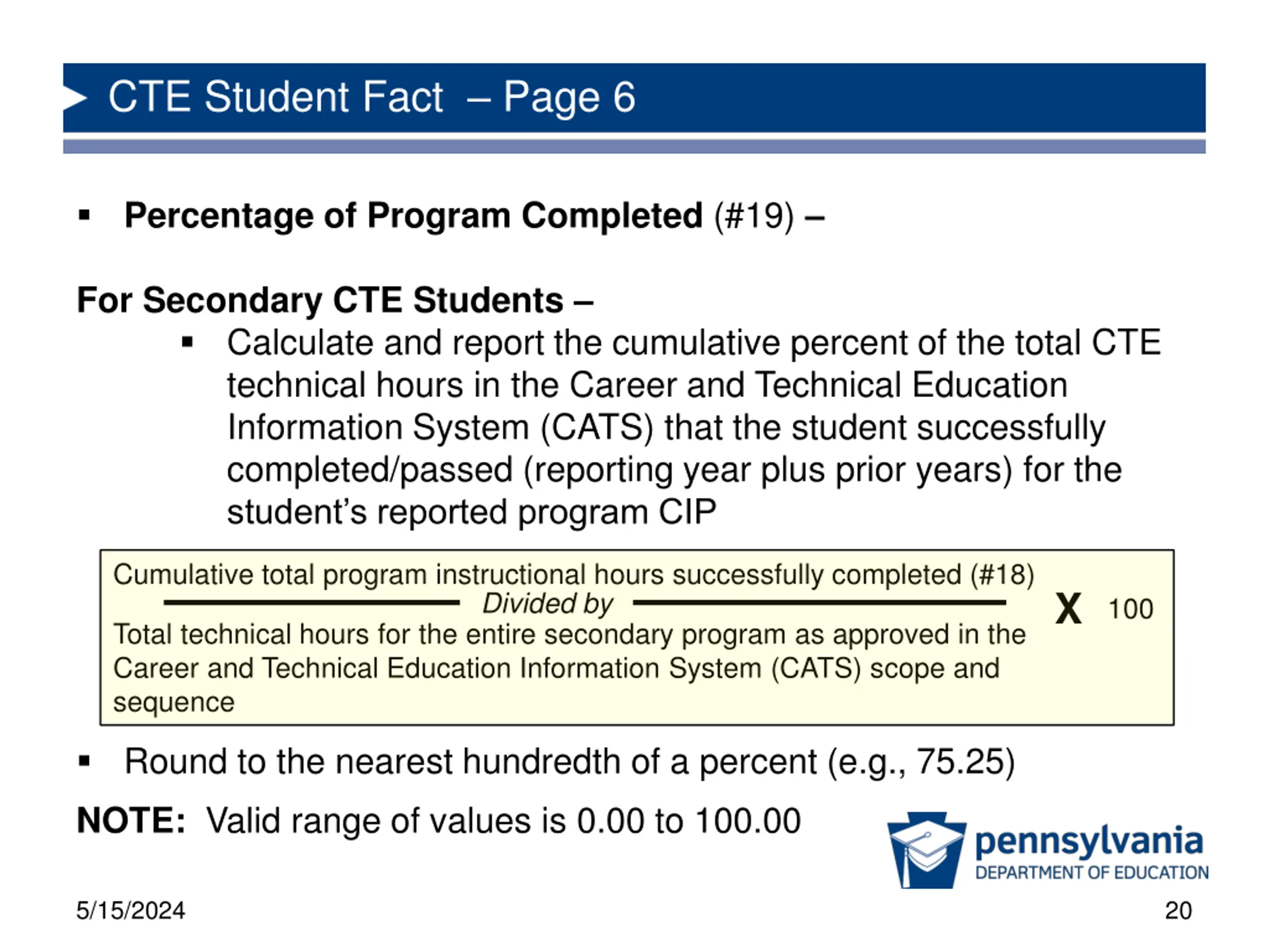CTE Student Fact Page 6 Percentage of Program Completed (#19) For Secondary CTE Students Calculate and report the cumulative percent of the total CTE technical hours in the Career and Technical Education Information System (CATS) that the student successfully completed/passed (reporting year plus prior years) for the student s reported program CIP Cumulative total program instructional hours successfully completed (#18) Divided by X 100 Total technical hours for the entire secondary program as approved in the Career and Technical Education Information System (CATS) scope and sequence Round to the nearest hundredth of a percent (e.g., 75.25) NOTE: Valid range of values is 0.00 to 100.00 5/15/2024 20