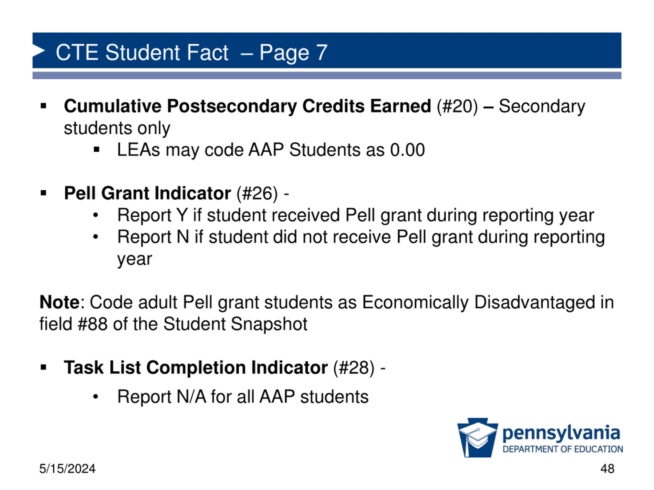 CTE Student Fact Page 7 Cumulative Postsecondary Credits Earned (#20) Secondary students only LEAs may code AAP Students as 0.00 Pell Grant Indicator (#26) - Report Y if student received Pell grant during reporting year Report N if student did not receive Pell grant during reporting year Note: Code adult Pell grant students as Economically Disadvantaged in field #88 of the Student Snapshot Task List Completion Indicator (#28) - Report N/A for all AAP students 5/15/2024 48