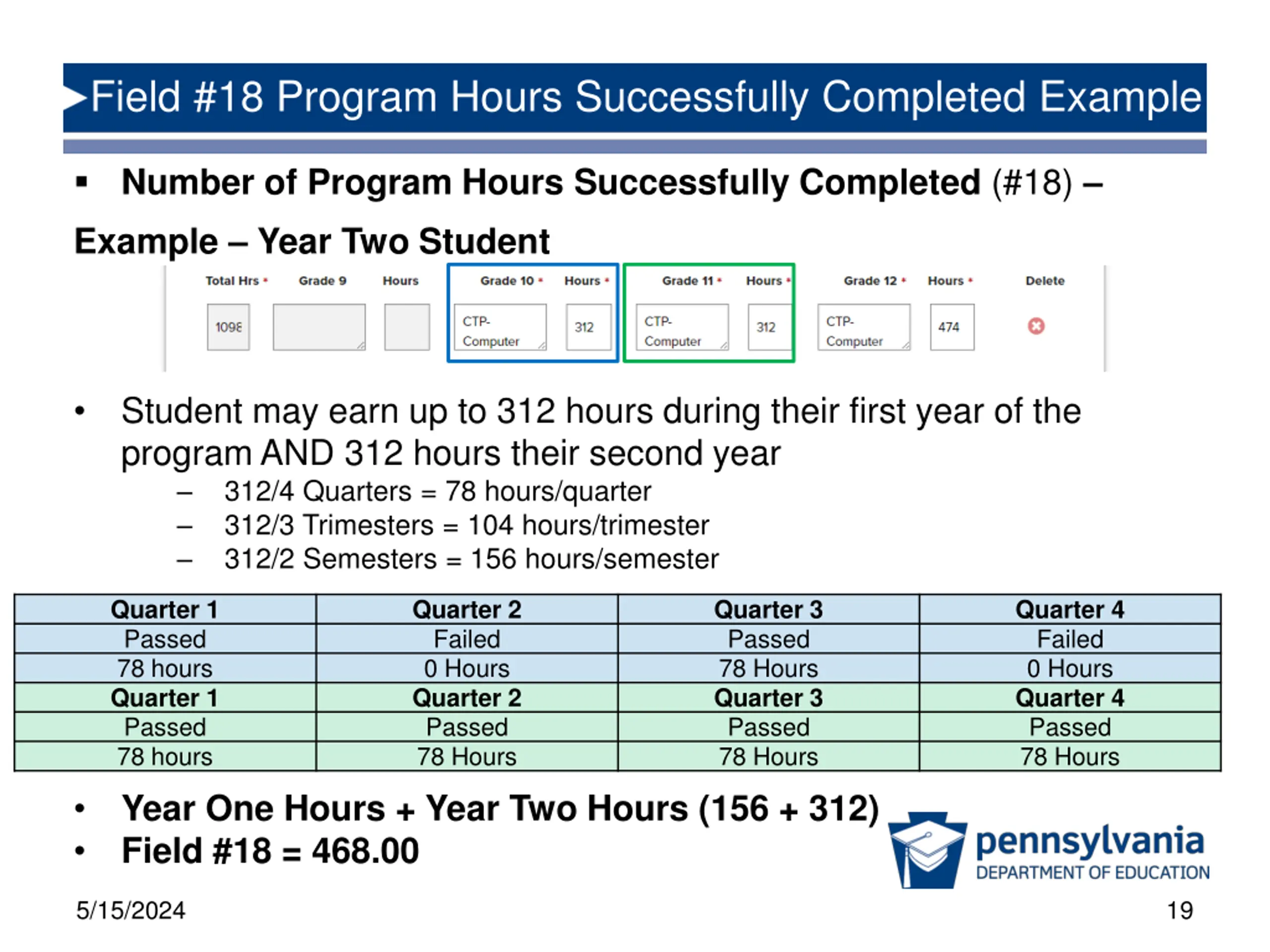 Field #18 Program Hours Successfully Completed Example Number of Program Hours Successfully Completed (#18) Example Year One Student Student may earn up to 312 hours during their first year of the program. 312/4 Quarters = 78 hours/quarter 312/3 Trimesters = 104 hours/trimester 312/2 Semesters = 156 hours/semester Quarter 1 Quarter 2 Passed Failed 78 hours 0 Hours Quarter 3 Passed 78 Hours Quarter 4 Failed 0 Hours Field #18 = 156.00 5/15/2024 18
