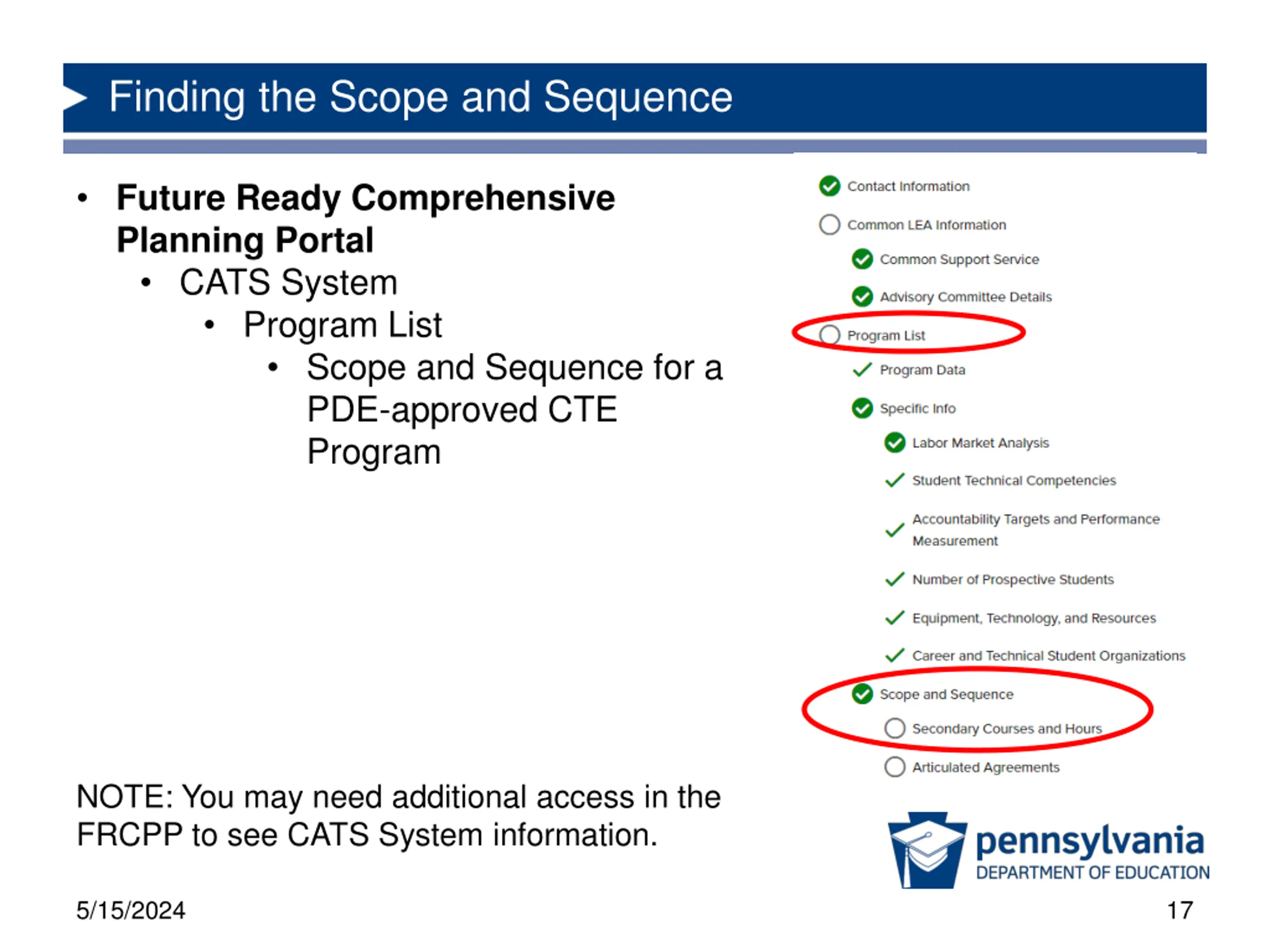 Finding the Scope and Sequence Future Ready Comprehensive Planning Portal CATS System Program List Scope and Sequence for a PDE-approved CTE Program NOTE: You may need additional access in the FRCPP to see CATS System information. 5/15/2024 17