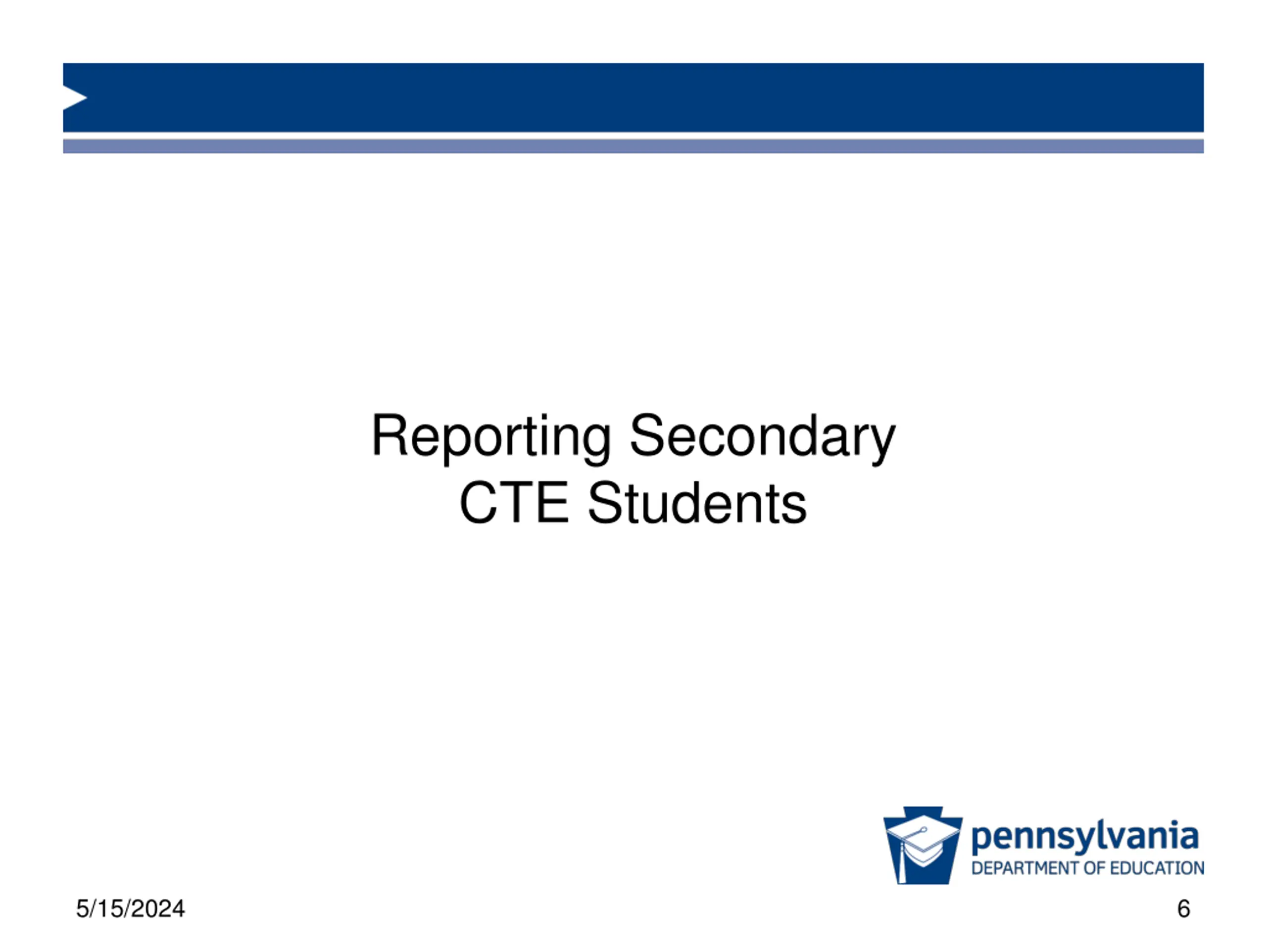 Reporting Secondary CTE Students Which secondary students need to be reported? Report secondary students: 1) Actively enrolled in the technical component of a PDE-approved secondary reimbursable CTE program during the 2023-24 reporting year; AND 2) Have a completed and signed Annual Educational and Occupational Objectives for Students Enrolled in a PDE-approved CTE Program form (PDE-408) or a similar, locally-developed form directly related to the student s enrollment in the CTE program reported within PIMS 5/15/2024 7
