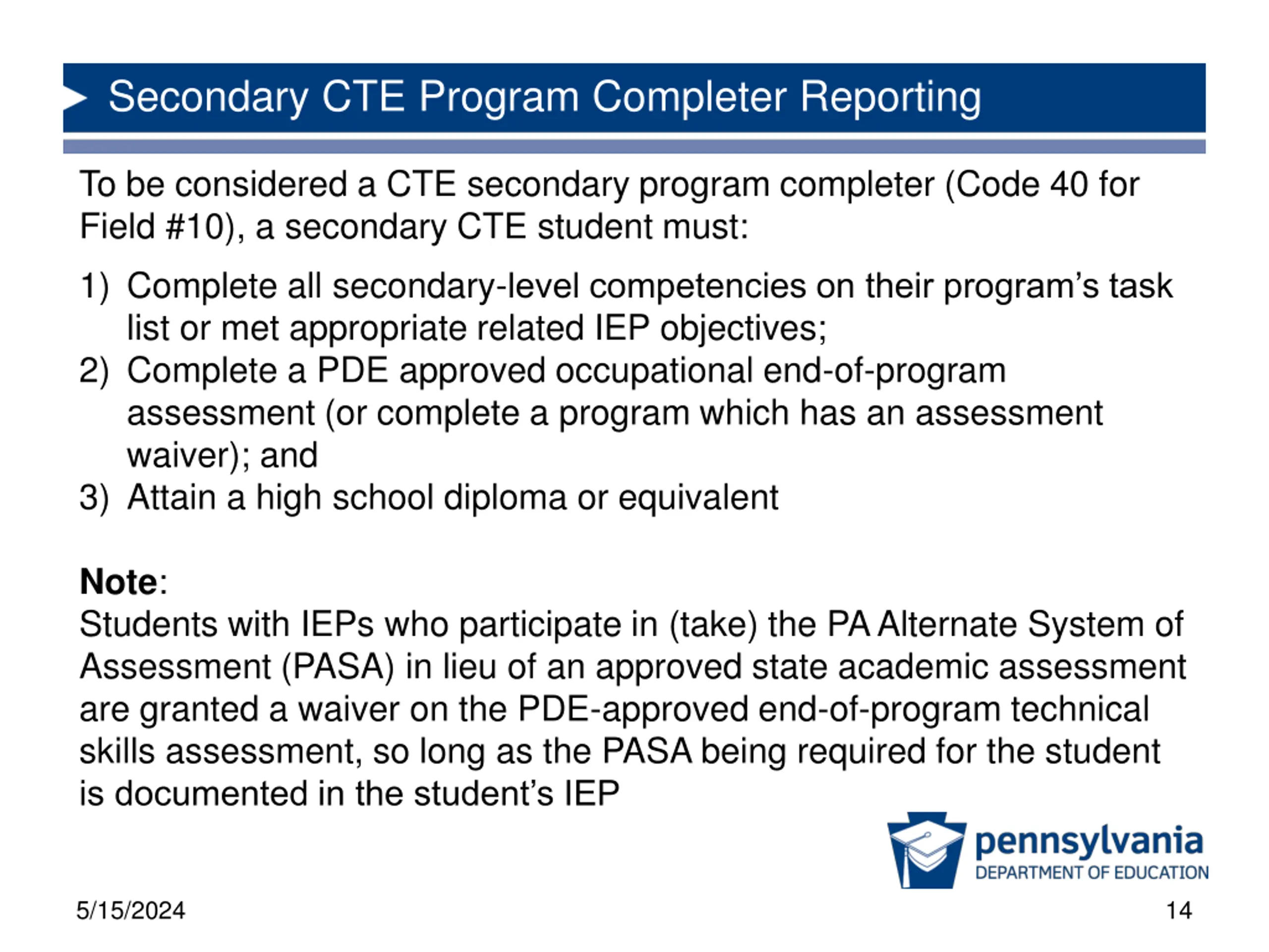 Secondary CTE Program Completer Reporting To be considered a CTE secondary program completer (Code 40 for Field #10), a secondary CTE student must: 1) Complete all secondary-level competencies on their program s task list or met appropriate related IEP objectives; 2) Complete a PDE approved occupational end-of-program assessment (or complete a program which has an assessment waiver); and 3) Attain a high school diploma or equivalent Note: Students with IEPs who participate in (take) the PA Alternate System of Assessment (PASA) in lieu of an approved state academic assessment are granted a waiver on the PDE-approved end-of-program technical skills assessment, so long as the PASA being required for the student is documented in the student s IEP 5/15/2024 14