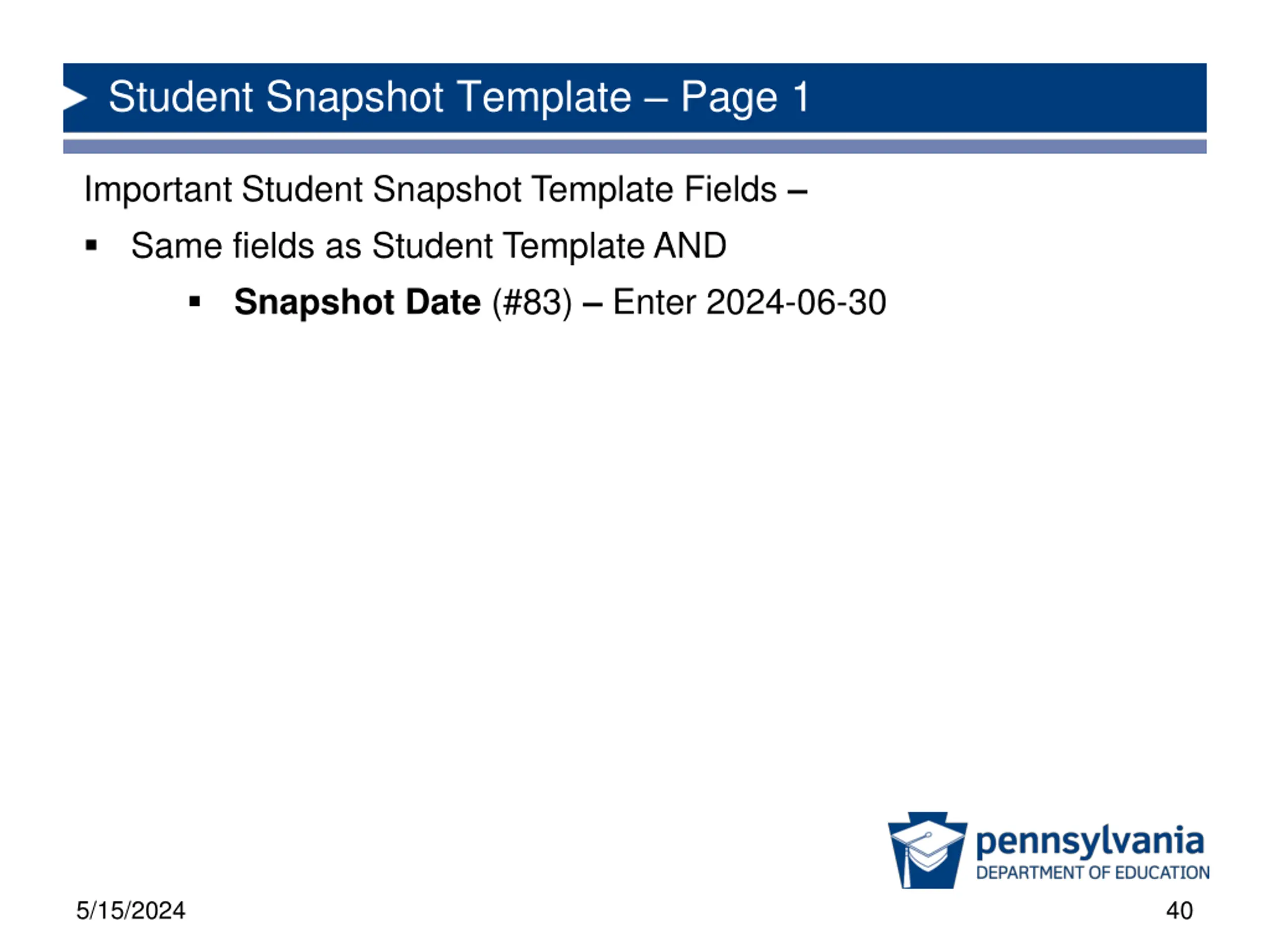 Student Snapshot Template Page 1 Important Student Snapshot Template Fields Same fields as Student Template AND Snapshot Date (#83) Enter 2024-06-30 5/15/2024 40