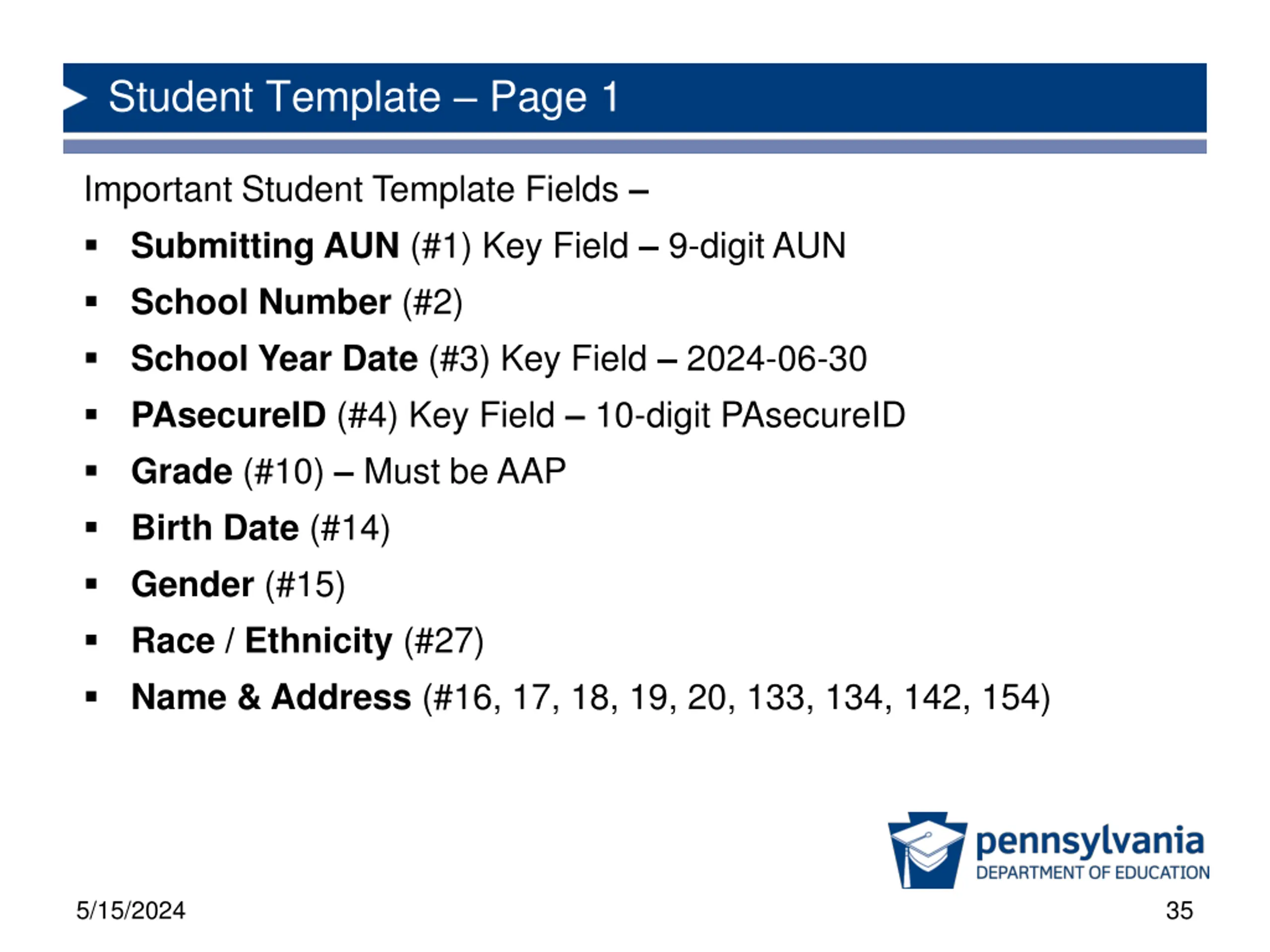 Student Template Page 1 Important Student Template Fields Submitting AUN (#1) Key Field 9-digit AUN School Number (#2) School Year Date (#3) Key Field 2024-06-30 PAsecureID (#4) Key Field 10-digit PAsecureID Grade (#10) Must be AAP Birth Date (#14) Gender (#15) Race / Ethnicity (#27) Name & Address (#16, 17, 18, 19, 20, 133, 134, 142, 154) 5/15/2024 35