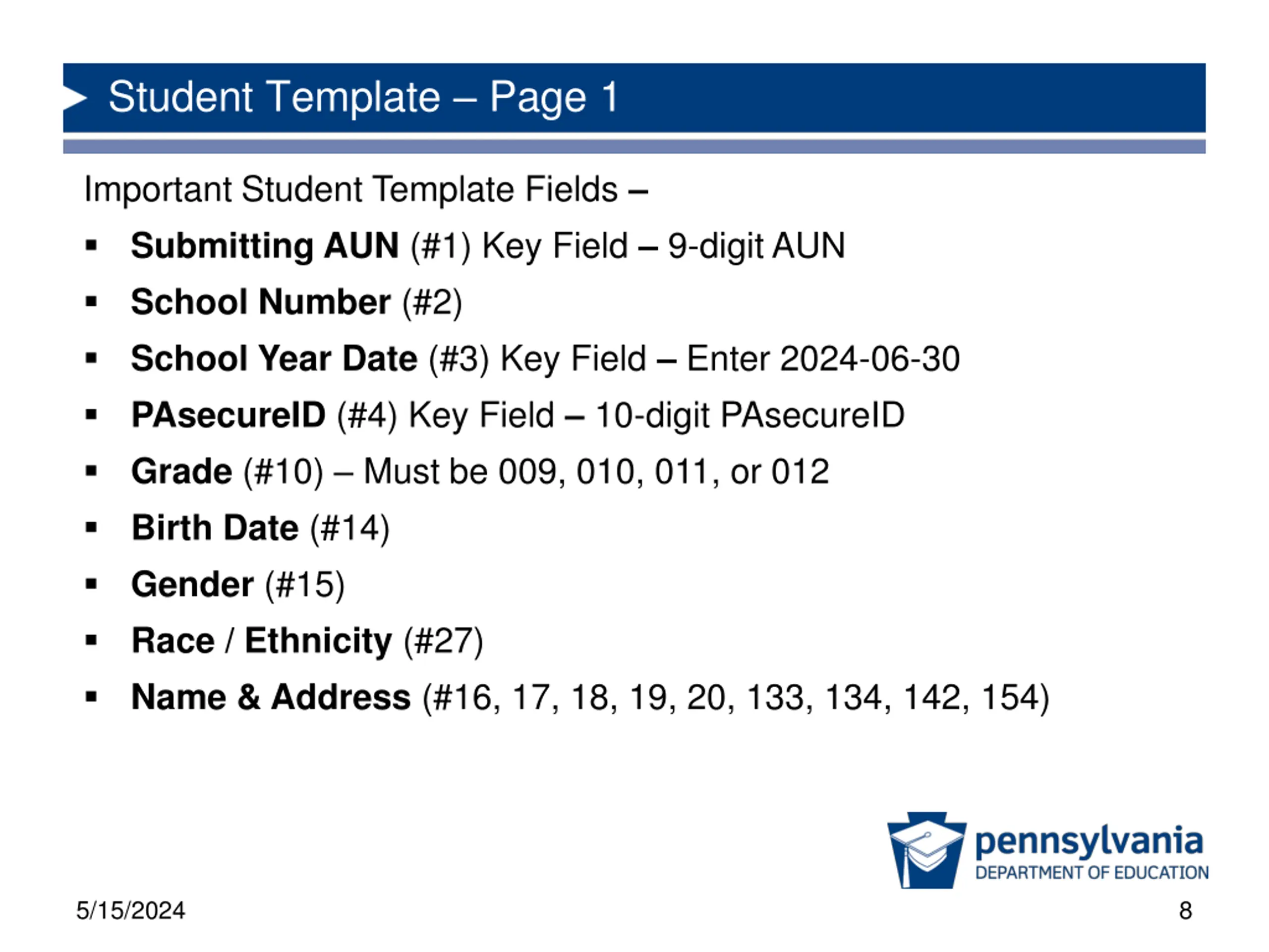 Student Template Page 1 Important Student Template Fields Submitting AUN (#1) Key Field 9-digit AUN School Number (#2) School Year Date (#3) Key Field Enter 2024-06-30 PAsecureID (#4) Key Field 10-digit PAsecureID Grade (#10) Must be 009, 010, 011, or 012 Birth Date (#14) Gender (#15) Race / Ethnicity (#27) Name & Address (#16, 17, 18, 19, 20, 133, 134, 142, 154) 5/15/2024 8