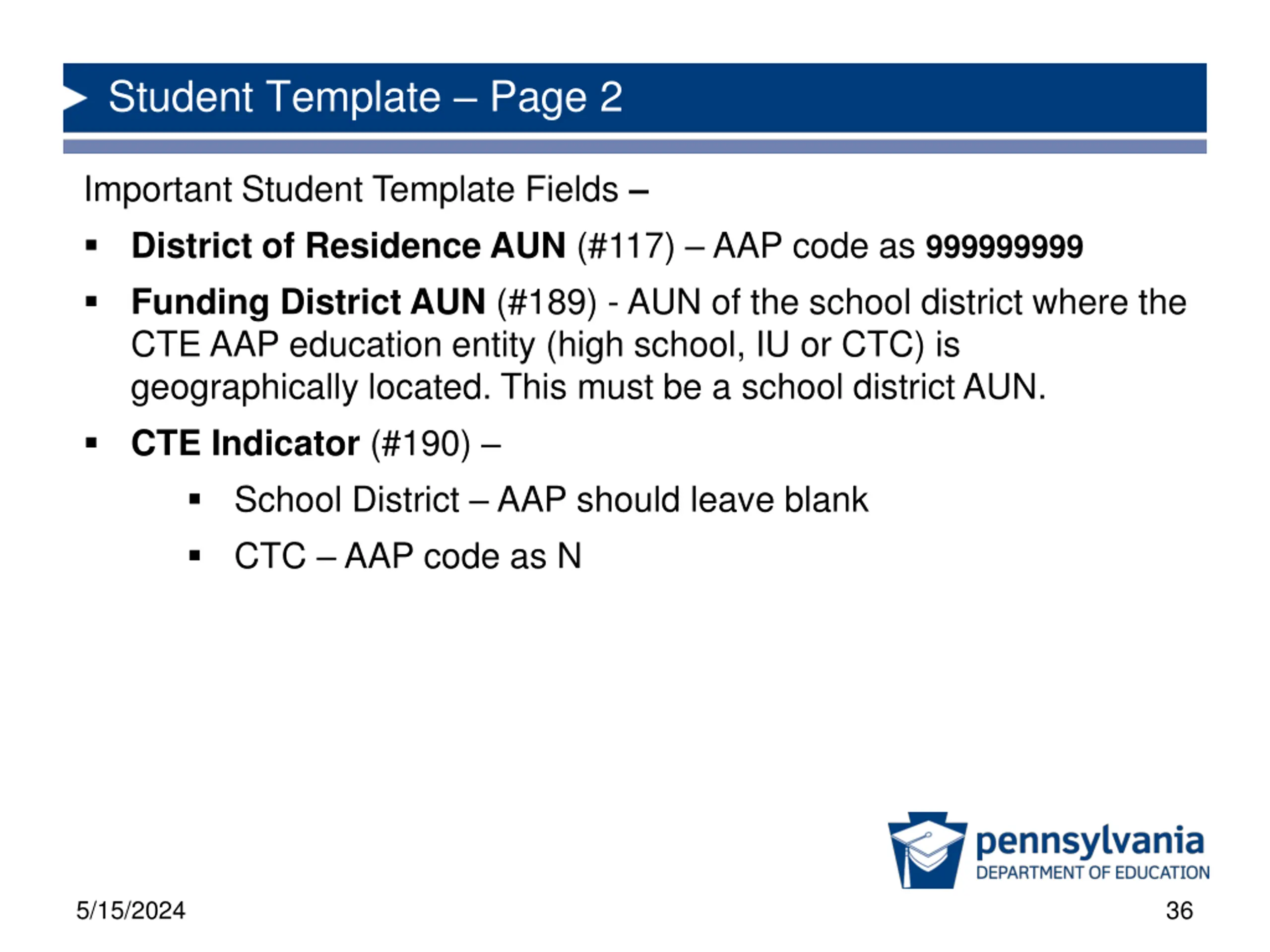 Student Template Page 2 Important Student Template Fields District of Residence AUN (#117) AAP code as 999999999 Funding District AUN (#189) - AUN of the school district where the CTE AAP education entity (high school, IU or CTC) is geographically located. This must be a school district AUN. CTE Indicator (#190) School District AAP should leave blank CTC AAP code as N 5/15/2024 36
