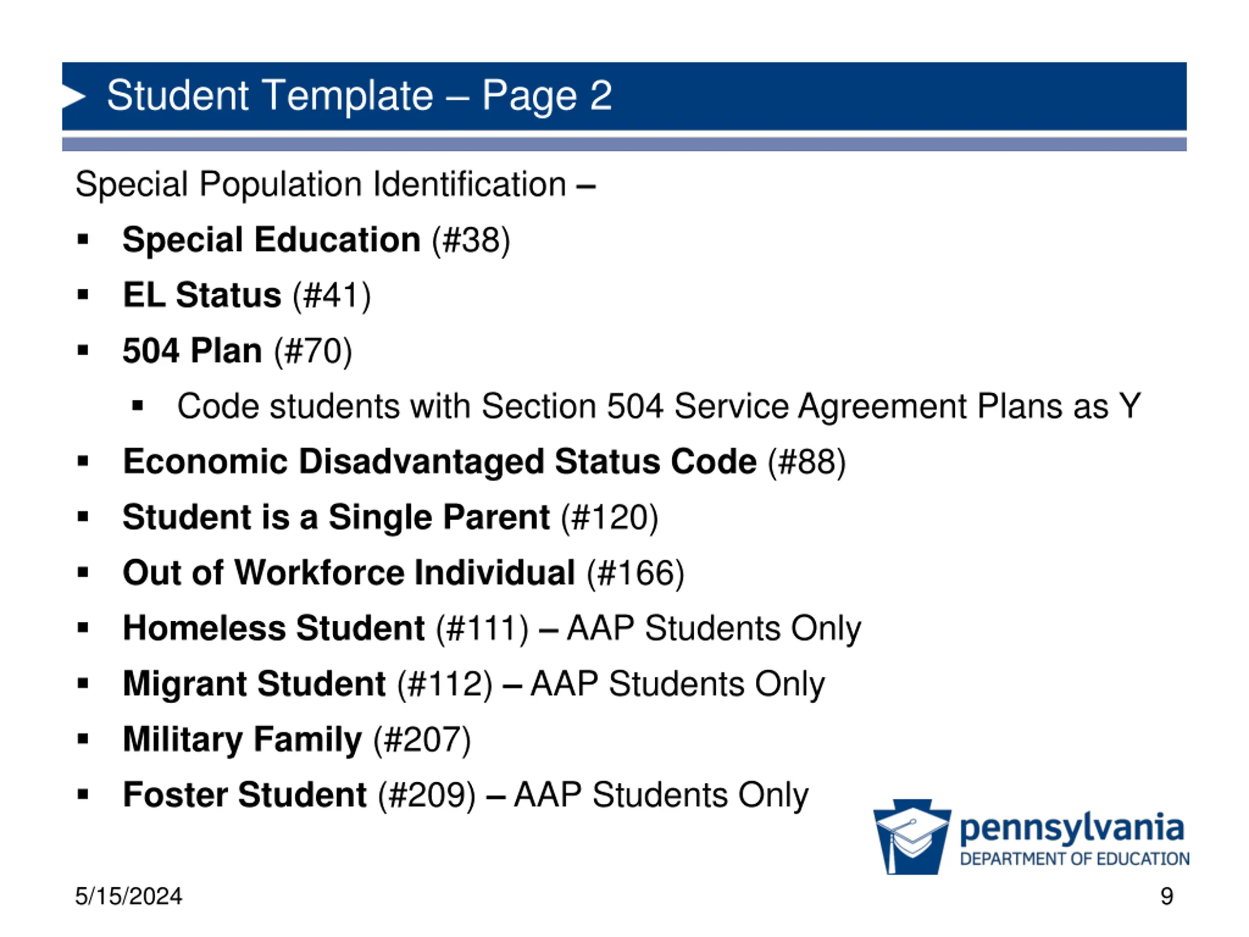 Student Template Page 2 Special Population Identification Special Education (#38) EL Status (#41) 504 Plan (#70) Code students with Section 504 Service Agreement Plans as Y Economic Disadvantaged Status Code (#88) Student is a Single Parent (#120) Out of Workforce Individual (#166) Homeless Student (#111) AAP Students Only Migrant Student (#112) AAP Students Only Military Family (#207) Foster Student (#209) AAP Students Only 5/15/2024 9