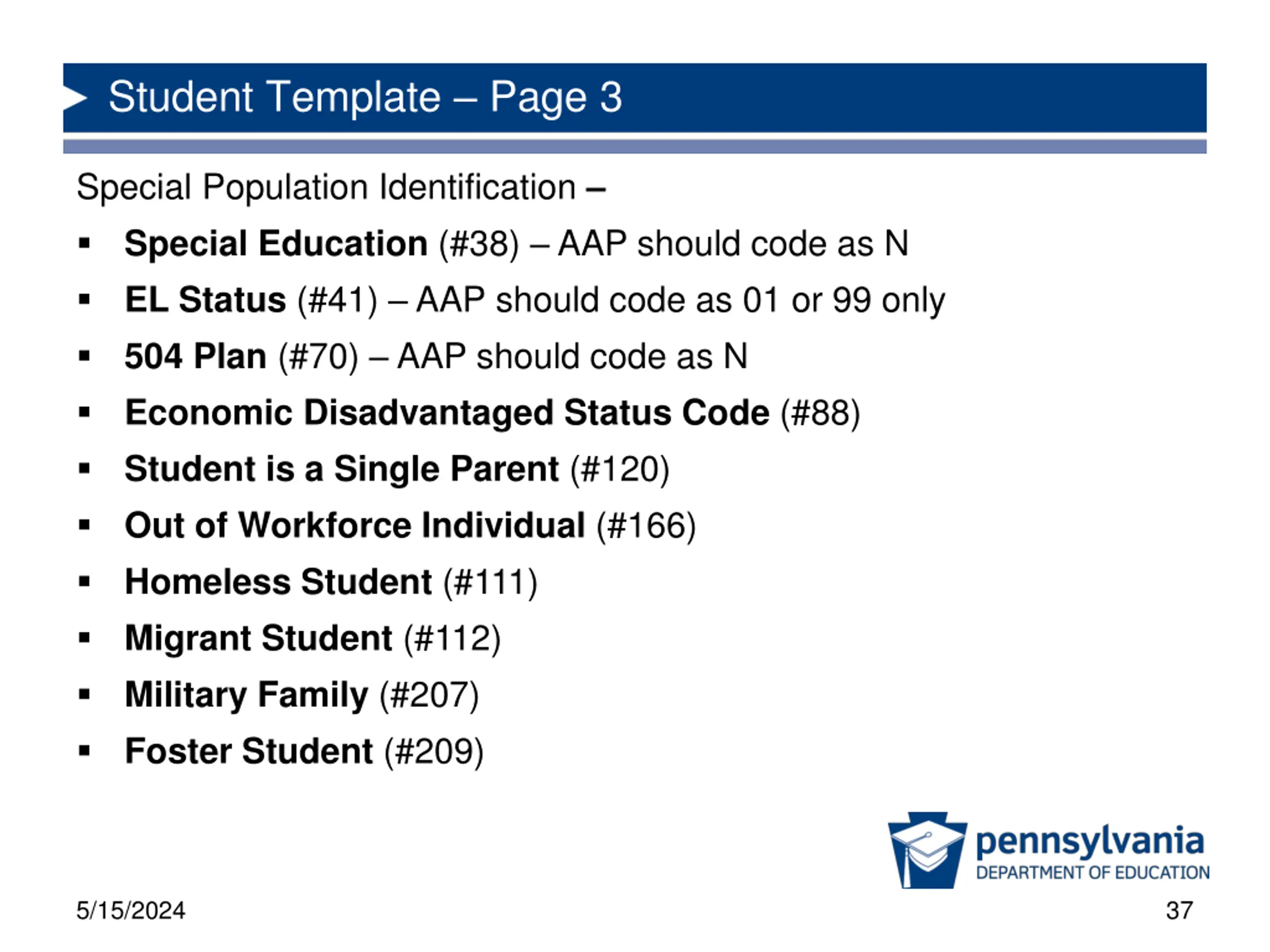 Student Template Page 3 Special Population Identification Special Education (#38) AAP should code as N EL Status (#41) AAP should code as 01 or 99 only 504 Plan (#70) AAP should code as N Economic Disadvantaged Status Code (#88) Student is a Single Parent (#120) Out of Workforce Individual (#166) Homeless Student (#111) Migrant Student (#112) Military Family (#207) Foster Student (#209) 5/15/2024 37
