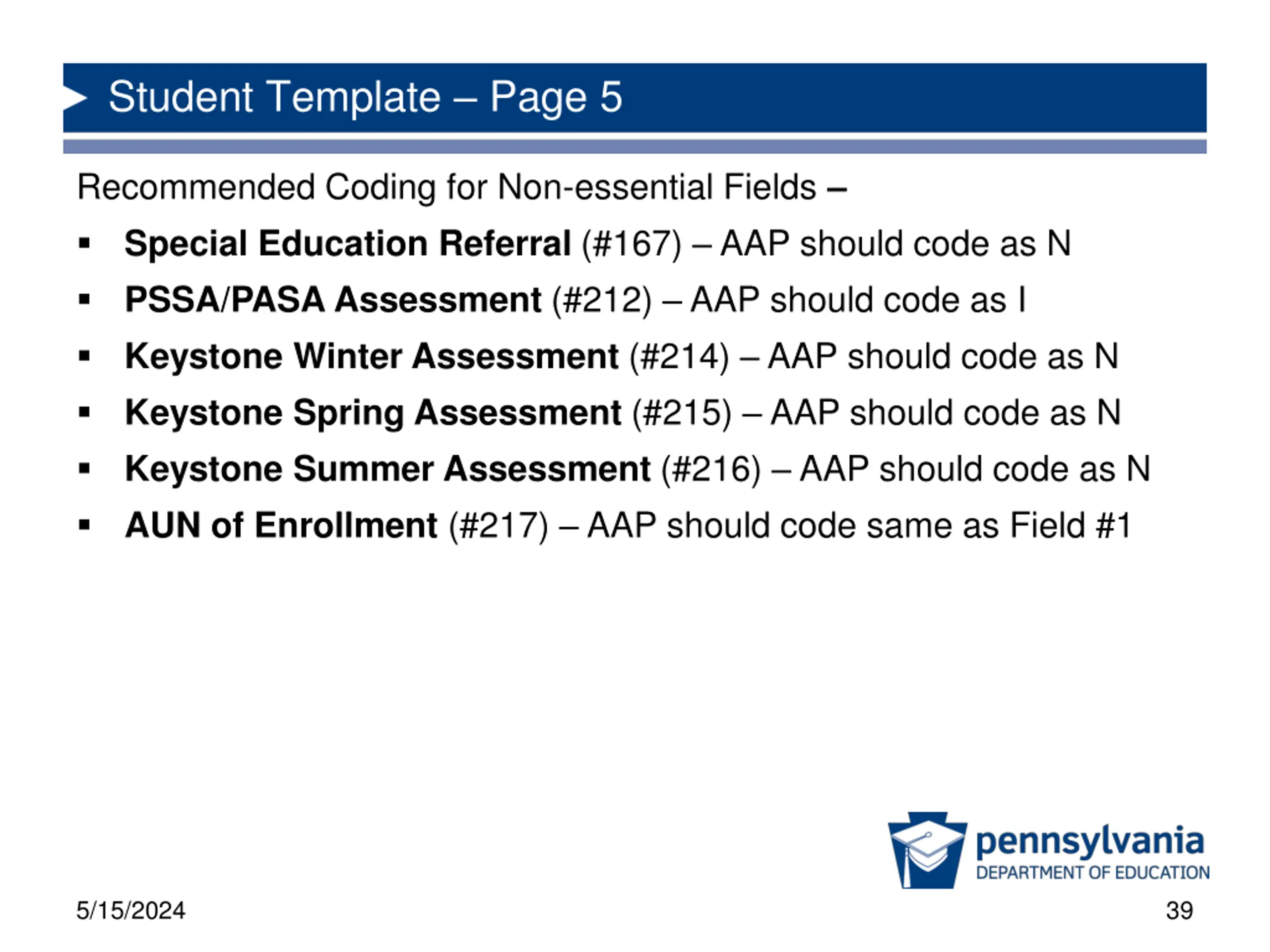Student Template Page 5 Recommended Coding for Non-essential Fields Special Education Referral (#167) AAP should code as N PSSA/PASA Assessment (#212) AAP should code as I Keystone Winter Assessment (#214) AAP should code as N Keystone Spring Assessment (#215) AAP should code as N Keystone Summer Assessment (#216) AAP should code as N AUN of Enrollment (#217) AAP should code same as Field #1 5/15/2024 39