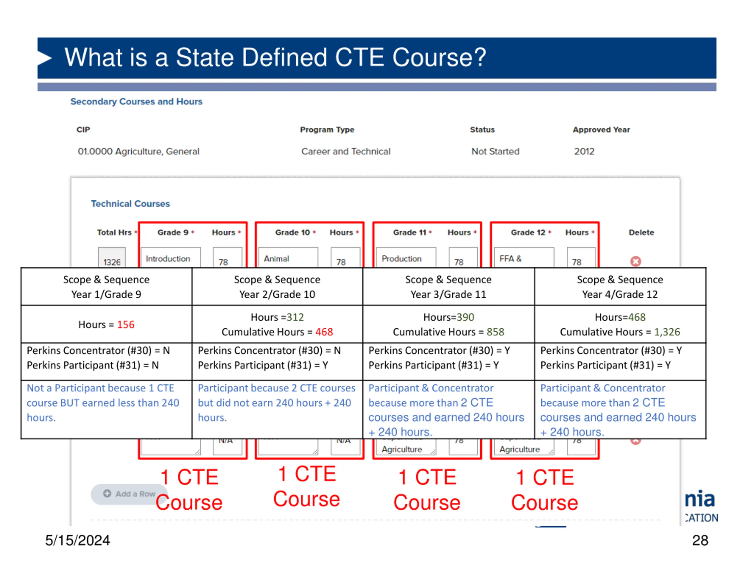 What is a State Defined CTE Course? Scope & Sequence Year 1/Grade 11 Hours = 360 Perkins Concentrator (#30) = N Perkins Participant (#31) = Y Participant because 1 CTE course and earned more than 240 hours. Scope & Sequence Year 2/Grade 12 Hours = 1,080 Cumulative Hours = 1,440 Perkins Concentrator (#30) = Y Perkins Participant (#31) = Y Participant & Concentrator because 2 CTE courses and earned 240 hours + 240 hours. 1 CTE Course 1 CTE Course 5/15/2024 27