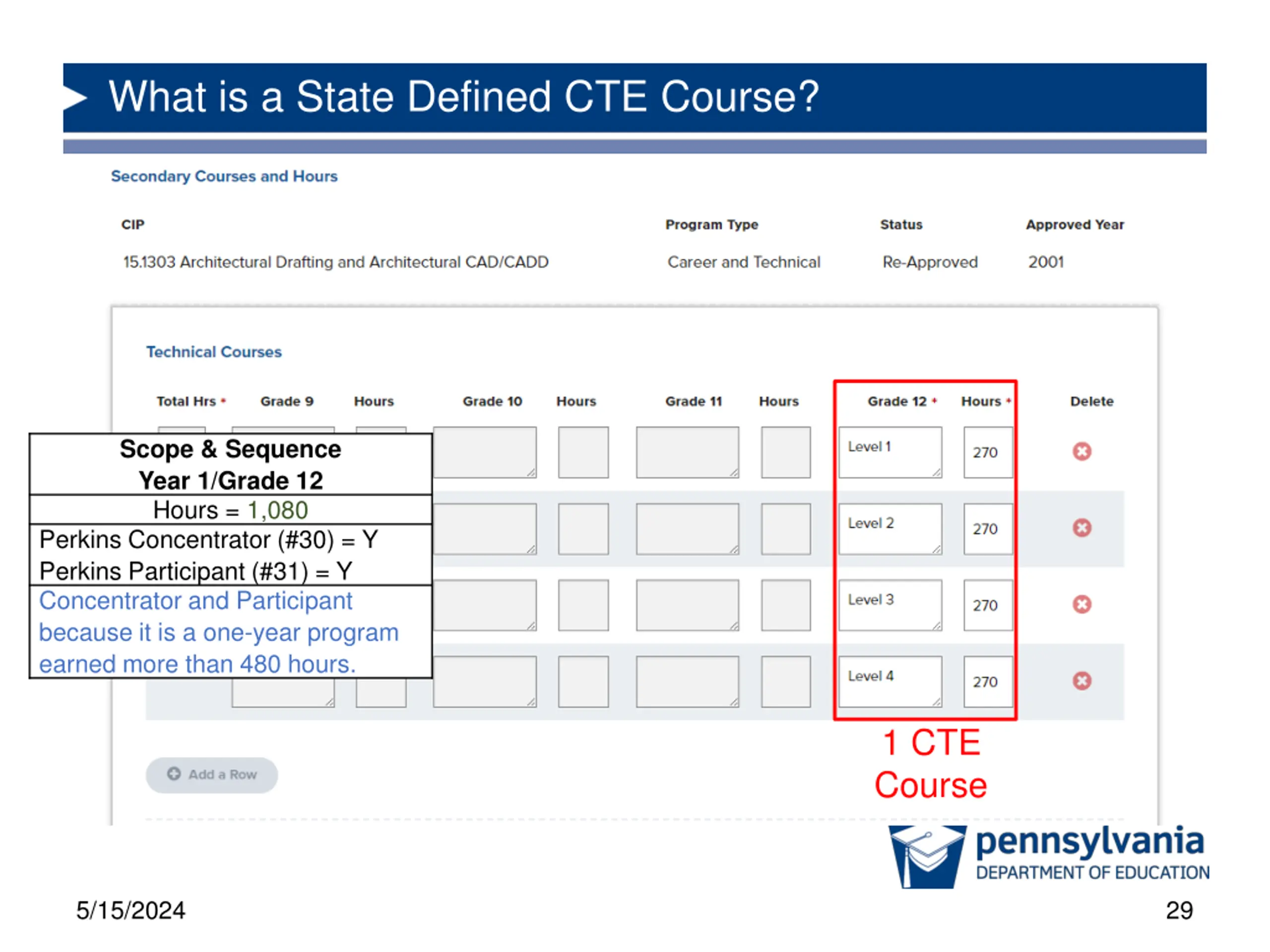 What is a State Defined CTE Course? Scope & Sequence Year 1/Grade 9 Scope & Sequence Year 2/Grade 10 Scope & Sequence Year 3/Grade 11 Scope & Sequence Year 4/Grade 12 Hours =312 Hours=390 Hours=468 Hours = 156 Cumulative Hours = 468 Cumulative Hours = 858 Cumulative Hours = 1,326 Perkins Concentrator (#30) = N Perkins Participant (#31) = N Perkins Concentrator (#30) = N Perkins Participant (#31) = Y Perkins Concentrator (#30) = Y Perkins Participant (#31) = Y Perkins Concentrator (#30) = Y Perkins Participant (#31) = Y Not a Participant because 1 CTE course BUT earned less than 240 hours. Participant because 2 CTE courses but did not earn 240 hours + 240 hours. Participant & Concentrator because more than 2 CTE courses and earned 240 hours + 240 hours. Participant & Concentrator because more than 2 CTE courses and earned 240 hours + 240 hours. 1 CTE Course 1 CTE Course 1 CTE Course 1 CTE Course 5/15/2024 28
