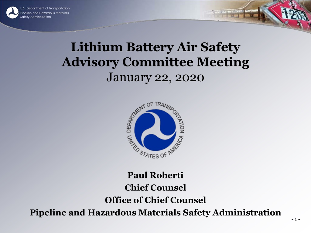 U.S. Department of Transportation Pipeline and Hazardous Materials Safety Administration Lithium Battery Air Safety Advisory Committee Meeting January 22, 2020 Paul Roberti Chief Counsel Office of Chief Counsel Pipeline and Hazardous Materials Safety Administration - 1 -
