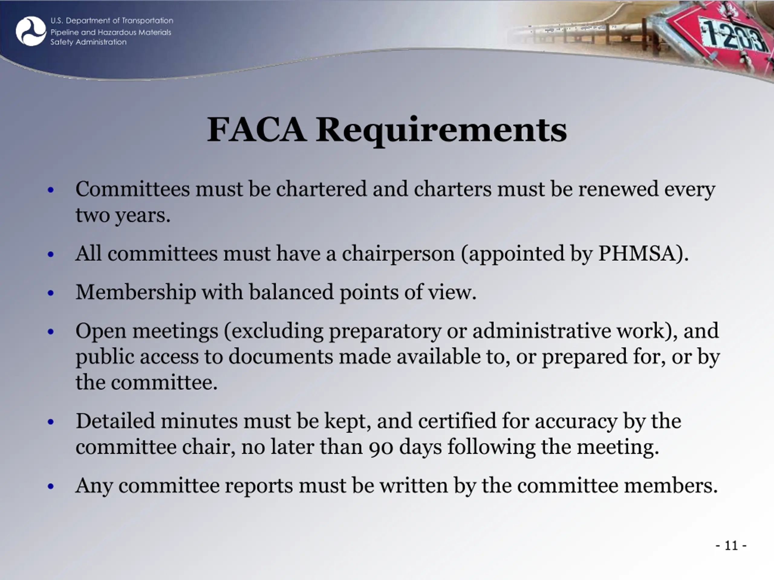U.S. Department of Transportation Pipeline and Hazardous Materials Safety Administration FACA Requirements Committees must be chartered and charters must be renewed every two years. All committees must have a chairperson (appointed by PHMSA). Membership with balanced points of view. Open meetings (excluding preparatory or administrative work), and public access to documents made available to, or prepared for, or by the committee. Detailed minutes must be kept, and certified for accuracy by the committee chair, no later than 90 days following the meeting. Any committee reports must be written by the committee members. - 11 -
